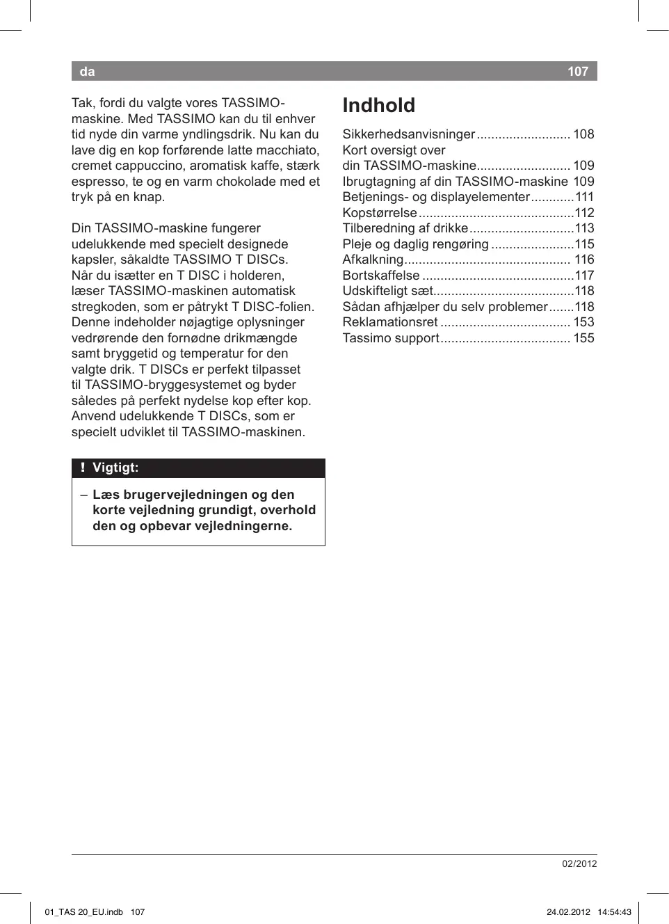 - Tassimo support !! Vigtigt: –– Læs brugervejledningen og den korte vejledning grundigt, overhold den og opbevar vejledningerne. 02/2012 01_TAS 20_EU.indb 107 p. 155