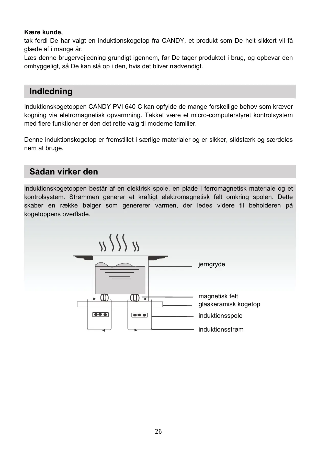 Kære kunde, tak fordi De har valgt en induktionskogetop fra CANDY, et produkt som De helt sikkert vil få glæde af i mange år. Læs denne brugervejledning grundigt igennem, før De tager produktet i brug, og opbevar den omhyggeligt, så De kan slå op i den, hvis det bliver nødvendigt. Indledning Induktionskogetoppen CANDY PVI 640 C kan opfylde de mange forskellige behov som kræver kogning via eletromagnetisk opvarmning. Takket være et micro-computerstyret kontrolsystem med flere funktioner er den det rette valg til moderne familier. Denne induktionskogetop er fremstillet i særlige materialer og er sikker, slidstærk og særdeles nem at bruge. Sådan virker den Induktionskogetoppen består af en elektrisk spole, en plade i ferromagnetisk materiale og et kontrolsystem. Strømmen generer et kraftigt elektromagnetisk felt omkring spolen. Dette skaber en række bølger som genererer varmen, der ledes videre til beholderen på kogetoppens overflade. jerngryde magnetisk felt glaskeramisk kogetop induktionsspole induktionsstrøm