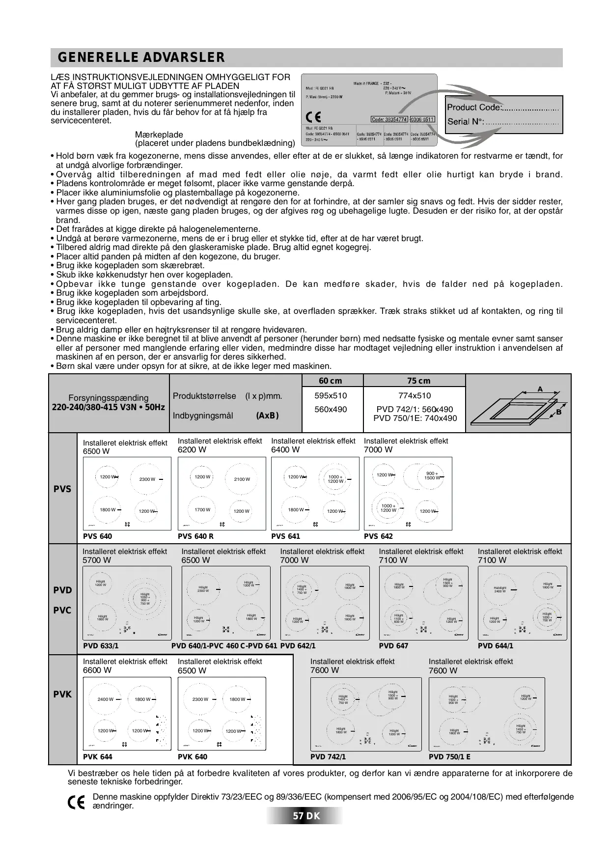 - Børn skal være under opsyn for at sikre, at de ikke leger med maskinen. 60 cm Produktstørrelse Forsyningsspænding 220-240/380-415 V3N • 50Hz Indbygningsmål Installeret elektrisk effekt 6500 W 1200 W 2300 W (l x p)mm. (AxB) 75 cm 595x510 774x510 560x490 PVD 742/1: 560x490 PVD 750/1E: 740x490 Installeret elektrisk effekt Installeret elektrisk effekt Installeret elektrisk effekt 6200 W 6400 W 7000 W 1200 W 2100 W 1200 W 1000 + 1200 W 1800 W 1200 W 900 + 1500 W 1200 W PVS 1800 W 1200 W PVS 640 1000 + 1200 W PVS 641 1200 W PVS 642 Installeret elektrisk effekt Installeret elektrisk effekt Installeret elektrisk effekt Installeret elektrisk effekt Installeret elektrisk effekt 5700 W 6500 W 7000 W 7100 W 7100 W PVD Hilight 1200 W Hilight 2300 W Hilight 1050 + 900 + 750 W Hilight 1800 W Hilight 1800 W Hilight 1200 W PVD 633/1 PVK 1200 W PVS 640 R Hilight 1200 W PVC 1700 W Hilight 1450 + 750 W Hilight 1200 W Hilight 1800 W Hilight 1800 W Hilight 1800 W Hilight 1100 + 600 W