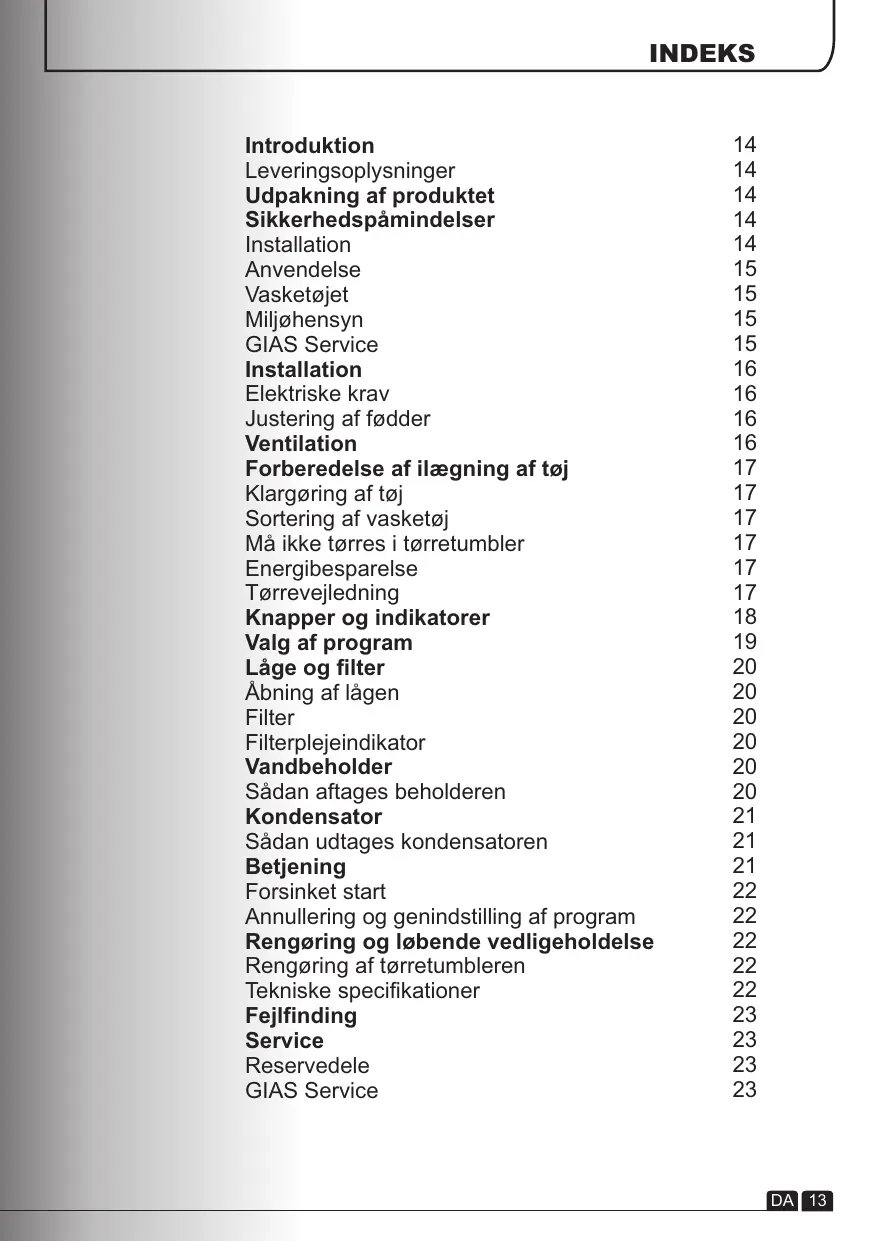 Oplysninger til Testlaboratorium EN 61121 Program -Tørt Bomuld -Tørt Bomuld Til Jern -Sarte Stoffer Program til at bruge - Skabstørt - Strygetørt -Skabstørt + Syntetisk VIGTIGT Sluk altid for og tag stikket ud af kontakten før apparatet rengøres. For elektriske data se klassificeringsetik etten på tørretumblerens forside (med lågen åben). FEJLFINDING Hvad Kan Det Skyldes At... Fejl du selv kan afhjælpe Før du ringer til GIAS Service for teknisk råd, beder vi dig tjekke følgende. Du vil få en regning, hvis maskinen fungerer som den skal, er blevet installeret ukorrekt eller er blevet misbrugt. Har du tjekket det du skal og varer problemet ved, skal du ringe til GIAS Service, som forhåbentligt kan hjælpe dig over telefonen. Tørretiden er for lang/tøjet er ikke tørt nok.... ● Har du valgt den korrekte tørretid/det korrekte program? ● Var tøjet for vådt? Var tøjet blevet vredet grundigt eller centrifugeret? ● Trænger filtret til at blive renset? ● Trænger kondensatoren til at blive rengjort? ● Er der for meget tøj i tørretumbleren? ● Er indløb, udløb og tørretumblerens bund fri for tilstopninger? ● Var der valgt i en tidligere tørrecyklus? Tørretumbleren fungerer ikke... ● Findes der en elektricitetsforsyning der virker til tørretumbleren? Kontroller det ved at anvende et andet apparat, som f.eks. en bordlampe. ● Er stikket korrekt forbundet til lysnettet? ● Er der strømsvigt? ●Er sikringen sprunget? ● Er lågen helt lukket? ● Er der tændt for tørretumbleren, både ved lysnettet og ved maskinen? ● Er der valgt tørretid eller program? ● Er der tændt for maskinen igen efter lågen har været åbnet? ● Er tørretumbleren standset, fordi vandbakken er fuld og skal tømmes? SERVICE Hvis der stadig er et problem med din tørretumbler efter hele den anbefalede kontrol er udført, bedes du ringe til GIAS Service for rådgivning. De vil måske kunne hjælpe dig over telefonen eller arrangere aftale om besøg af en tekniker I henhold til din garantis bestemmelser. Der kan imidlertid opkræves et gebyr, hvis følgende finder anvendelse på din maskine: ● Det konstateres, at den fungerer. ● Er ikke blevet installeret i overensstemmelse med installationsvejledningen. ● Er blevet anvendt forkert. Reservedele Der må kun bruges originale reservedele direkte fra GIAS Service. GIAS Service For service eller reparation, ring til din lokale GIAS servicetekniker. Tørretumbleren larmer for meget.... ● Sluk for tørretumbleren og kontakt GIAS Service. Indikatoren er tændt… ● Trænger filtret til at blive renset? ● Trænger kondensatoren til at blive rengjort? Indikatoren er tændt… ● Skal vandbeholderen tømmes? Fabrikanten fralægger sig alt ansvar i tilfælde af trykfejl i denne instruktionsbog. Fabrikanten forbeholder sig også retten til at foretage passende ændringer i deres produkt uden at ændre ved dets væsentligste karakteristika. DA 23 INDEKS Innledning Leveringsinformasjon Pakke ut produktet Sikkerhetspåminnelser Bruk Installasjon Tøyet Miljømessige hensyn GIAS Service Installasjon Elektriske krav Justere føttene Ventilasjon Gjøre klart tøyet Sjekk av tøyet før tørking Sortering av tøyet Ikke bruk tørketrommel Energisparing Tørkeguide Kontrollpanel og indikatorlamper Velge program Dør og filter Åpne døren Filter Indikator for filtervedlikehold Vannbeholder Slik fjerner du beholderen Kondensator Slik fjerner du kondensatoren Drift Avbryte og nullstille programmet Startforsinkelse Rengjøring og rutinemessig vedlikehold Tekniske spesifikasjoner Rengjøring av tørketrommelen Feilsøking Kundeservice Reservedeler GIAS Service NO 24