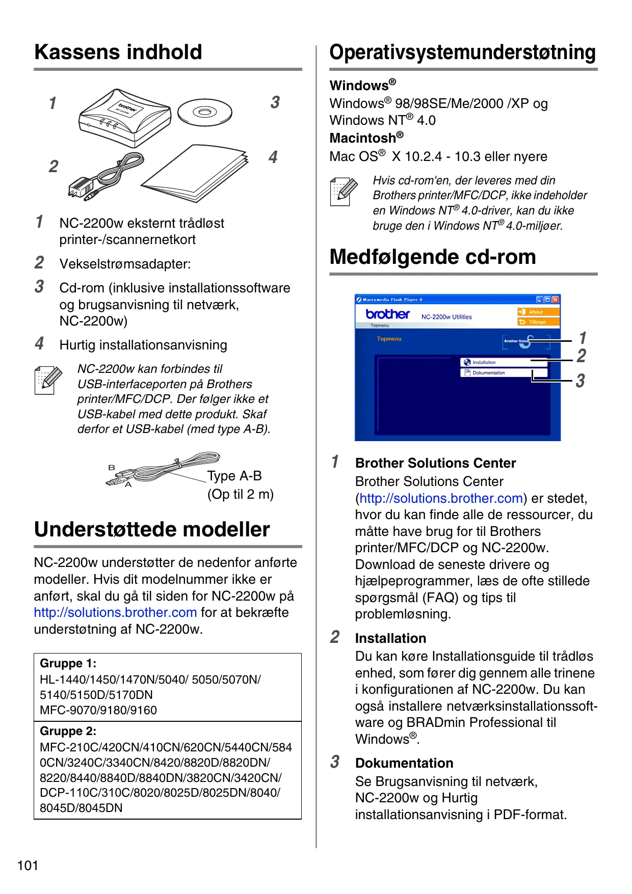 Læs denne Hurtig installationsanvisning, for du installerer NC-2200w og bruger Brothers printer/MFC/DCP pà det trädlose netværk. Se Brugsanvisning til NC-2200w pà den medfolgende cd-rom for at fà flere oplysninger om, hvordan du optimerer NC-2200w.