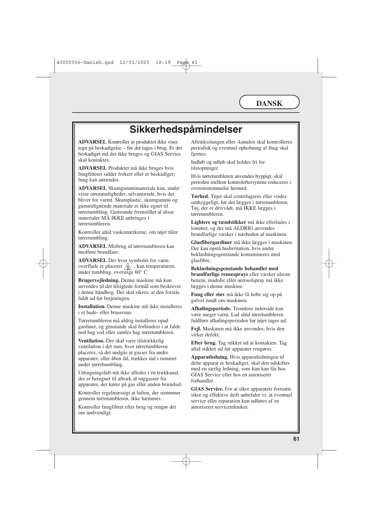 Il est nécessaire d’inspecter régulièrement le tuyau ou la conduite de ventilation et d’éliminer les accumulations éventuelles de peluches. Les entrées et sorties doivent être libres d’obstructions. Si le sèche-linge est utilisé fréquemment, les intervalles entre les inspections doivent être réduits en conséquence. Degré de séchage. Les vêtements doivent être essorés en machine ou à la main avant d’être placés dans le sèche-linge. Les vêtements qui dégoulinent NE DOIVENT PAS être mis dans le sèche-linge. Enlevez les briquets et les allumettes des poches et veillez à ne JAMAIS utiliser de liquides inflammables à proximité de la machine. Les rideaux en fibres de verre ne doivent jamais être placés dans cette machine. La contamination d’autres vêtements par les fibres de verre peut entraîner des irritations de la peau. Les vêtements traités ou contaminés par des produits de nettoyage ou des liquides inflammables, comme le pétrole, l’huile de cuisson ou les aérosols ne doivent pas être placés dans la machine. Veillez à ce que les peluches ne puissent pas s’accumuler sur le sol, à l’extérieur de la machine. Période de refroidissement. Il se peut que l’intérieur du tambour soit très chaud. Veillez à ce que le sèche-linge termine son cycle de refroidissement avant d’en sortir le linge. Pannes. Cessez d’utiliser la machine si elle semble défectueuse. Après usage. Débranchez du courant de secteur. Retirez toujours la prise avant de nettoyer la machine. Cordon d’alimentation. Si le cordon d’alimentation de cet appareil est endommagé, il doit être remplacé par un cordon spécial exclusivement disponible auprès de GIAS Service ou d’un distributeur agréé. Service GIAS. Pour veiller au fonctionnement sûr et efficace de cet appareil, il est conseillé de faire appel à un technicien agréé pour les entretiens et les réparations.