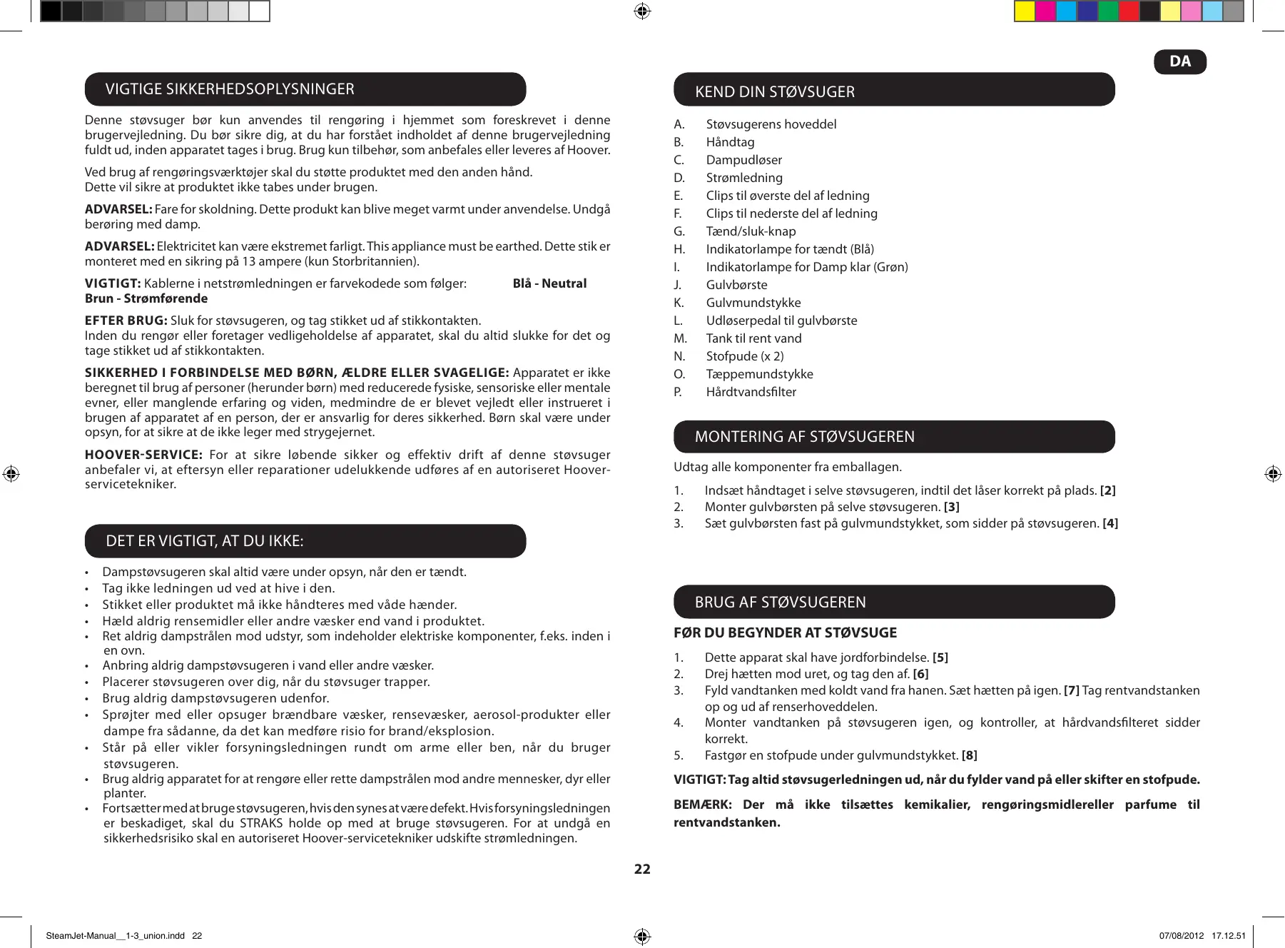 Støvsugerens hoveddel Håndtag Dampudløser Strømledning Clips til øverste del af ledning Clips til nederste del af ledning Tænd/sluk-knap Indikatorlampe for tændt (Blå) Indikatorlampe for Damp klar (Grøn) Gulvbørste Gulvmundstykke Udløserpedal til gulvbørste Tank til rent vand Stofpude (x 2) Tæppemundstykke Hårdtvandsfilter Dampstøvsugeren skal altid være under opsyn, når den er tændt. Tag ikke ledningen ud ved at hive i den. Stikket eller produktet må ikke håndteres med våde hænder. Hæld aldrig rensemidler eller andre væsker end vand i produktet. Ret aldrig dampstrålen mod udstyr, som indeholder elektriske komponenter, f.eks. inden i en ovn. Anbring aldrig dampstøvsugeren i vand eller andre væsker. Placerer støvsugeren over dig, når du støvsuger trapper. Brug aldrig dampstøvsugeren udenfor. Sprøjter med eller opsuger brændbare væsker, rensevæsker, aerosol-produkter eller dampe fra sådanne, da det kan medføre risio for brand/eksplosion. Står på eller vikler forsyningsledningen rundt om arme eller ben, når du bruger støvsugeren. Brug aldrig apparatet for at rengøre eller rette dampstrålen mod andre mennesker, dyr eller planter. Fortsætter med at bruge støvsugeren, hvis den synes at være defekt. Hvis forsyningsledningen er beskadiget, skal du STRAKS holde op med at bruge støvsugeren. For at undgå en sikkerhedsrisiko skal en autoriseret Hoover-servicetekniker udskifte strømledningen. Indsæt håndtaget i selve støvsugeren, indtil det låser korrekt på plads. [2] Monter gulvbørsten på selve støvsugeren. [3] Sæt gulvbørsten fast på gulvmundstykket, som sidder på støvsugeren. [4] Brug af støvsugeren FØR DU BEGYNDER AT STØVSUGE