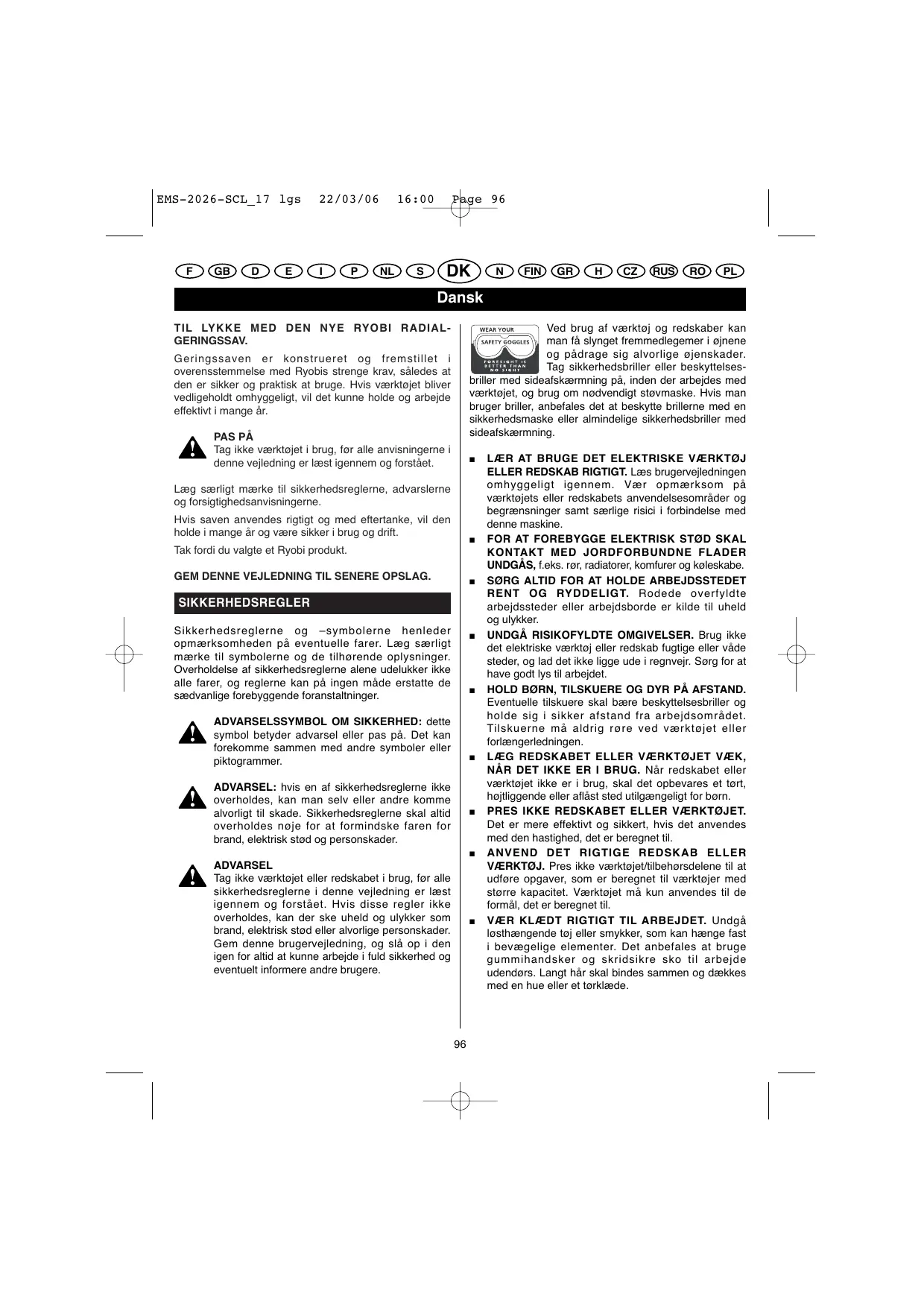 Dansk TIL LYKKE MED DEN NYE RYOBI RADIALGERINGSSAV. Ved brug af værktøj og redskaber kan man få slynget fremmedlegemer i øjnene og pådrage sig alvorlige øjenskader. Tag sikkerhedsbriller eller beskyttelsesbriller med sideafskærmning på, inden der arbejdes med værktøjet, og brug om nødvendigt støvmaske. Hvis man bruger briller, anbefales det at beskytte brillerne med en sikkerhedsmaske eller almindelige sikkerhedsbriller med sideafskærmning. Geringssaven er konstrueret og fremstillet i overensstemmelse med Ryobis strenge krav, således at den er sikker og praktisk at bruge. Hvis værktøjet bliver vedligeholdt omhyggeligt, vil det kunne holde og arbejde effektivt i mange år. PAS PÅ Tag ikke værktøjet i brug, før alle anvisningerne i denne vejledning er læst igennem og forstået.