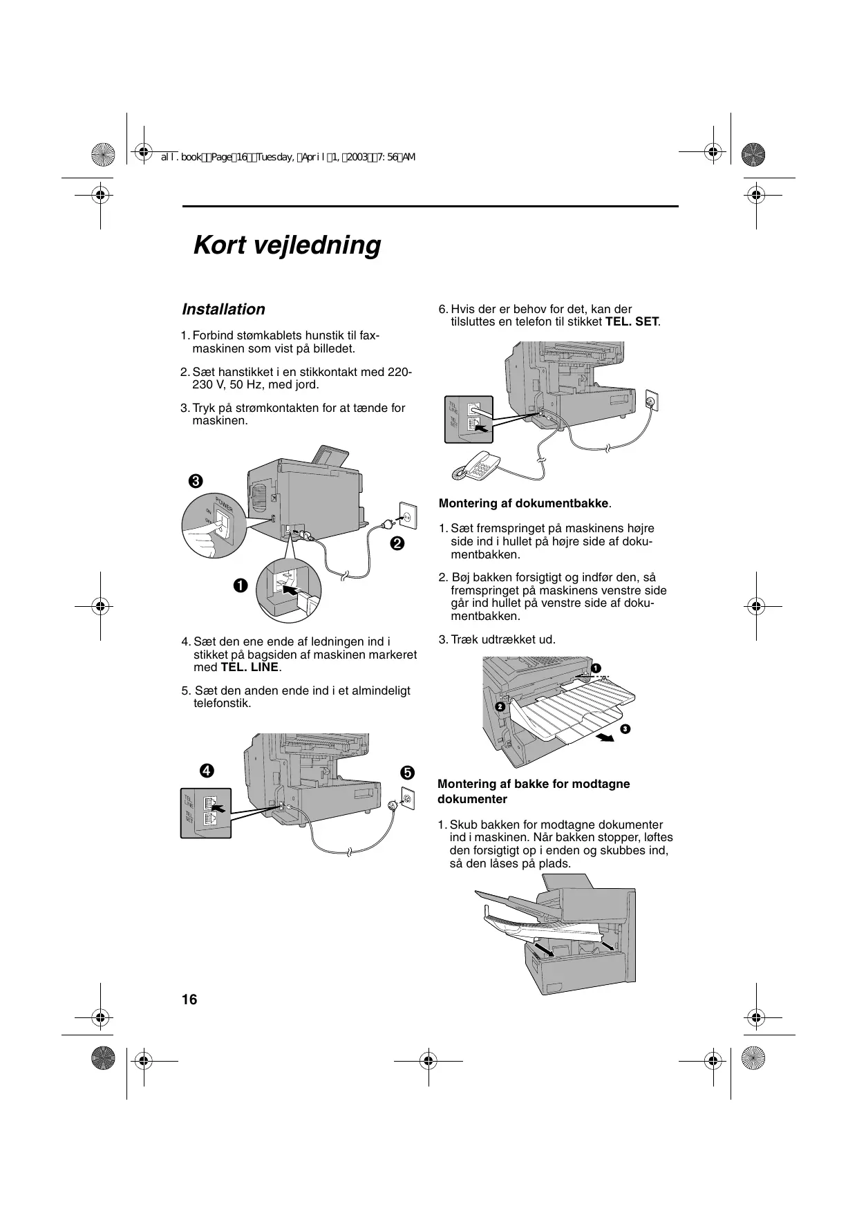 fremspringet pà maskinens venstre side gâär ind hullet pä venstre side af doku- mentbakken. 4.Sæt den ene ende af ledningen ind i 3. Træk udtrækket ud. stikket pä bagsiden af maskinen markeret med TEL. LINE.