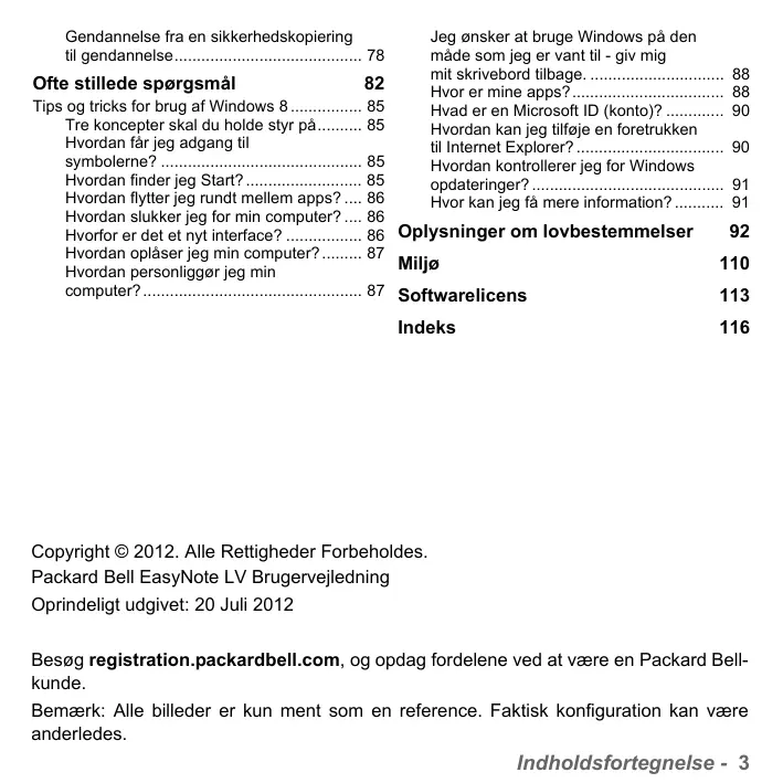 2,420 - 2,4835 GHz (canaux 5 à 13) autorisé en usage extérieur Pour tout le territoire Français : Seulement 5,15 -5,35 GHz autorisé pour le 802.11a L'utilisation de cet equipement (2,4 GHz WLAN) est soumise à certaines restrictions : - La puissance maximale autorisée en intérieur est de 100 mW pour 2400 - 2483,5 MHz. - La puissance maximale autorisée est de 100 mW en extérieur pour 2400 - 2454 MHz. - La puissance maximale autorisée est de 10 mW en extérieur, 2454 - 2483,5 MHz. Pour les dernières restrictions, voir http://www.art-telecom.fr. Italy The use of these equipments is regulated by: 1.D.L.gs 1.8.2003, n. 259, article 104 (activity subject to general authorization) for outdoor use and article 105 (free use) for indoor use, in both cases for private use. Pour les enregistrements et licences, veuillez contacter l'IBPT. In geval van privé-gebruik, buiten een gebouw, op een openbare plaats, is geen registratie nodig, wanneer de afstand minder dan 300 m is. Voor een afstand groter dan 300 m is een registratie bij BIPT vereist. Voor registraties en licenties, gelieve BIPT te contacteren. Brazil Este equipamento opera em caráter secundário, isto é, não tem direito a proteção contra interferência prejudicial, mesmo de estações do mesmo tipo, e não pode causar interferência a sistemas operando em caráter primário. Vérification du niveau de la batterie Enregistrement 5 Optimiser l’autonomie de la batterie Installation des logiciels 6 Avertissement de batterie basse Récupération 6 Vous avez des problèmes ? 7 Gestion de l’alimentation Informatique de base 8 Économie d’énergie Sécurité et confort 8 Logiciels Précautions de sécurité 8 Utiliser Windows et de vos logiciels Précautions de santé 12 Offre de sécurité Internet Packard Bell Recovery Management Apprendre à connaître votre