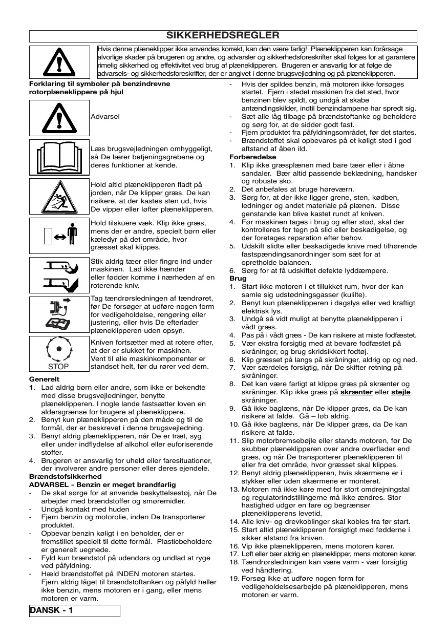 Verklaring van de symbolen op de roterende Indien er benzine wordt gemorst, mag de motor niet worden gestart en dient de machine uit de buurt van de gemorste grasmaaimachine met benzinemotor vlek te worden geduwd; elke vorm van ontsteking moet worden vermeden totdat de vlek geheel is vervlogen. Zorg, dat de tankdop en dop van de container altijd Waarschuwing goed vast worden gedraaid. Voordat u de motor start, dient u de machine uit de buurt te duwen van de plaats waar u de tank heeft bijgevuld. Lees de handleiding voor de Brandstof moet op een koele plaats worden gebruiker aandachtig door, zodat u opgeslagen, uit de buurt van open vlammen. volledig vertrouwd bent met de Voorbereiding verschillende bedieningselementen 1. Maai het gras nooit op blote voeten of met sandalen en de werking daarvan. aan. Draag altijd geschikte kleding, handschoenen Zorg, dat de maaimachine tijdens het en stevige schoenen. maaien altijd in contact blijft met de grond. De maaimachine opbergen 1. Berg uw maaimachine nooit direct na gebruik op. 2. Wacht altijd tot de motor voldoende is afgekoeld om potentieel brandgevaar te vermijden. 3. Reinig uw maaimachine. 4. Berg de machine op een koele, droge plaats op waar de maaier niet kan worden beschadigd. Hvis du slår borti en gjenstand. Bruk ikke gressklipperen før du er sikker på at hele gressklipperen er i forsvarlig stand etter sammenstøtet Hvis gressklipperen begynner å vibrere unormalt er dette tegn på ubalanse i roterende deler. Klipperen bør kontrolleres av et serviceverksted før den brukes videre. Overdreven vibrasjon kan føre til skade. Vedlikehold og oppbevaring 7. Si tiene que vaciar el depósito de combustible, hágalo al aire libre. 8. Tenga cuidado durante el ajuste de la máquina para evitar que los dedos se atasquen entre las cuchillas en movimiento y las piezas fijas de la máquina.