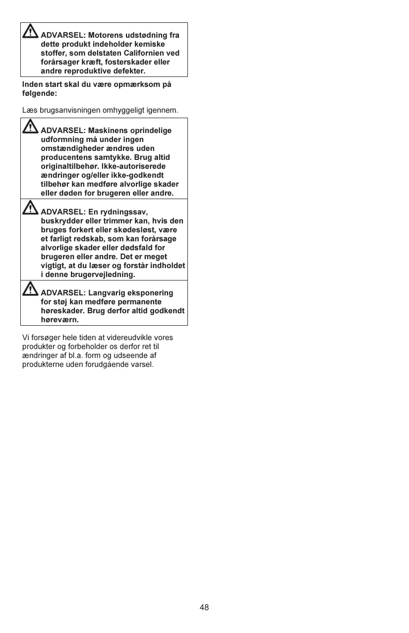 Contrôler les points suivants avant la mise en marche : Lisez attentivement le manuel d’utilisation. AVERTISSEMENT : Ne jamais modifier sous aucun prétexte la machine sans l’autorisation du fabricant. N’utiliser que des accessoires et des pièces d’origine. Des modifications nonautorisées et l’emploi d’accessoires non-homologués peuvent provoquer des accidents graves et même mortels, à l’utilisateur ou d’autres personnes. AVERTISSEMENT : Utilisés de manière négligente ou erronée, les scies d'éclaircissement et les coupe-herbes peuvent devenir des outils dangereux pouvant occasionner des blessures très graves, voire mortelles à l’utilisateur ou à d’autres personnes présentes. Il est très important de lire attentivement et de bien assimiler le contenu de ce manuel de l'opérateur. AVERTISSEMENT : Une exposition prolongée au bruit risque de causer des lésions auditives permanentes. Toujours utiliser des protecteurs d'oreilles agréés. Nous travaillons continuellement au développement de ses produits et nous réservons le droit d’en modifier, entre autres, la conception et l’aspect sans préavis.