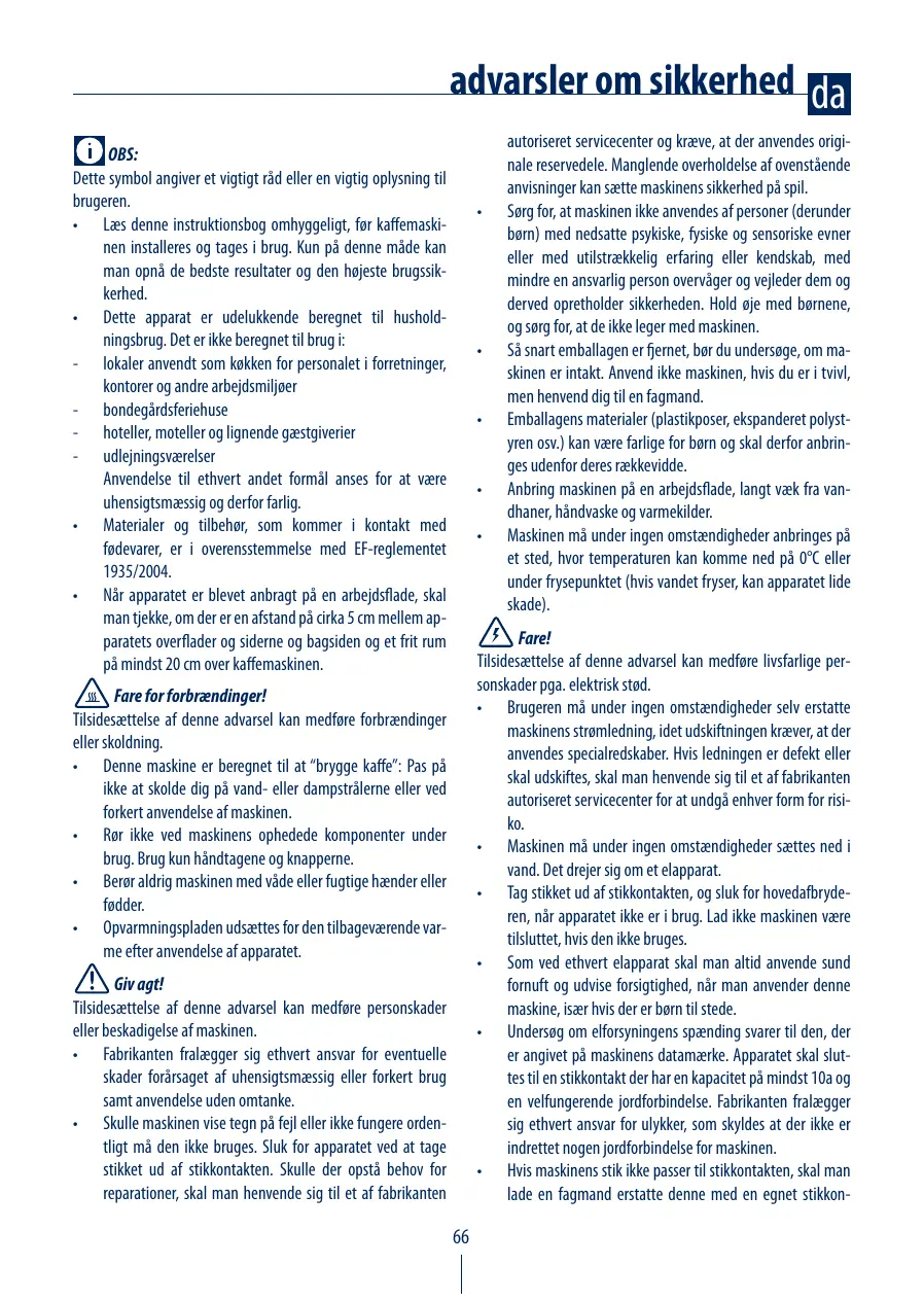 advarsler om sikkerhed da OBS: Dette symbol angiver et vigtigt råd eller en vigtig oplysning til brugeren. • Læs denne instruktionsbog omhyggeligt, før kaffemaskinen installeres og tages i brug. Kun på denne måde kan man opnå de bedste resultater og den højeste brugssikkerhed. • Dette apparat er udelukkende beregnet til husholdningsbrug. Det er ikke beregnet til brug i: - lokaler anvendt som køkken for personalet i forretninger, kontorer og andre arbejdsmiljøer - bondegårdsferiehuse - hoteller, moteller og lignende gæstgiverier - udlejningsværelser Anvendelse til ethvert andet formål anses for at være uhensigtsmæssig og derfor farlig. • Materialer og tilbehør, som kommer i kontakt med fødevarer, er i overensstemmelse med EF-reglementet 1935/2004. • Når apparatet er blevet anbragt på en arbejdsflade, skal man tjekke, om der er en afstand på cirka 5 cm mellem apparatets overflader og siderne og bagsiden og et frit rum på mindst 20 cm over kaffemaskinen.