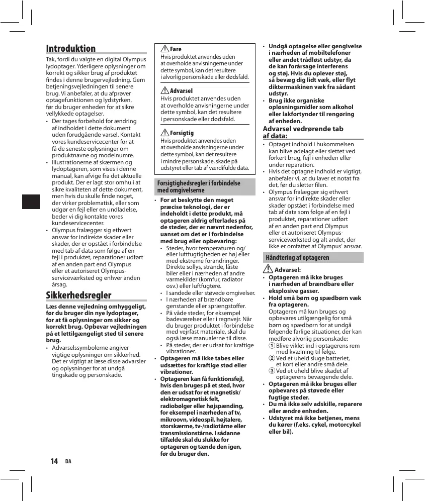 • For at forhindre utætheder eller skader på batteriernes poler skal du omhyggeligt følge alle vejledninger om brugen af batterierne. Forsøg aldrig at skille et batteri ad eller ændre det på nogen måde, for eksempel ved lodning el. lign. • Hvis der kommer batterivæske i øjnene, skal øjnene straks skylles med rent, koldt rindende vand, og der skal omgående søges lægehjælp. f Advarsel: • Batterierne skal altid holdes tørre. • Brug ikke et batteri, hvis det er revnet eller ødelagt. • Batterier må aldrig udsættes for kraftige stød eller konstante vibrationer. • Hvis et batteri bliver utæt, misfarvet eller deformeret, eller hvis det på nogen anden måde bliver unormalt under brugen, skal du holde op med at bruge optageren. • Hvis et batteri lækker væske på dit tøj eller din hud, skal du fjerne tøjet og straks skylle det berørte område med rent, rindende koldt vand. Hvis du får forbrændinger på huden fra væsken, skal du omgående søge lægehjælp. • Batteriet skal opbevares utilgængeligt for børn. • Gør følgende, hvis du bemærker noget usædvanligt, når du bruger produktet, f.eks. unormal støj, varme, røg eller røglugt: 1 fjern omgående batteriet (pas på, du ikke brænder dig), og 2 Kontakt forhandleren eller det lokale Olympus-serviceværksted for at få produktet efterset. f Forsigtig: • Vær venlig at aflevere batterierne til genbrug af hensyn til miljøet. Når du kasserer brugte batterier, skal du dække deres poler og altid overholde lokale love og bestemmelser.