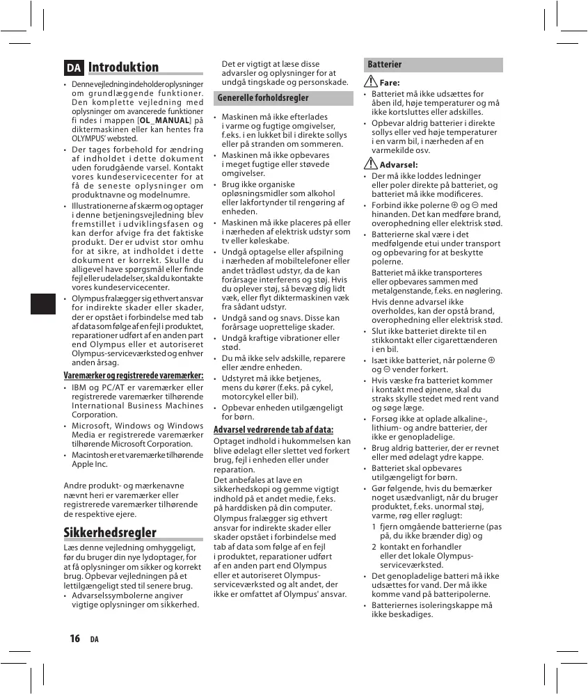 8 kHz, 11 kHz, 16 kHz, 22 kHz, 32 kHz, 44,1 kHz, 48 kHz • Le contenu de ce document peut être modifié par la suite sans préavis. Veuillez contacter notre centre de service après-vente pour obtenir les dernières informations concernant les noms de produits et les numéros de modèles. • Le plus grand soin a été pris afin d’assurer l’intégrité du contenu de ce document. Dans le cas peu probable où vous auriez un doute ou si vous trouvez une erreur ou une omission,veuillez contacter notre centre de service après-vente. • Toute responsabilité pour dommages passifs ou dommages de quelque nature que ce soit survenus à cause d’une perte de données causée par un défaut du produit, réparation effectuée par un tiers autre que Olympus ou un service agréé par Olympus, ou toute autre raison est exclue.