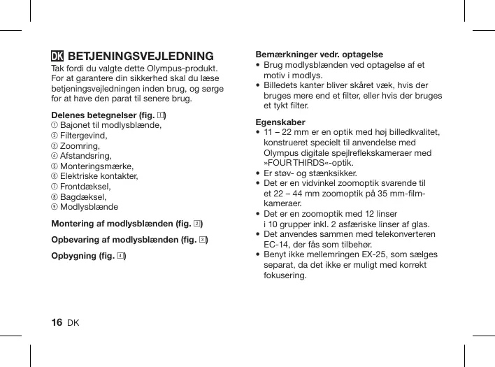 DK BETJENINGSVEJLEDNING Tak fordi du valgte dette Olympus-produkt. For at garantere din sikkerhed skal du læse betjeningsvejledningen inden brug, og sørge for at have den parat til senere brug. Delenes betegnelser (fig. 1) 1 Bajonet til modlysblænde, 2 Filtergevind, 3 Zoomring, 4 Afstandsring, 5 Monteringsmærke, 6 Elektriske kontakter, 7 Frontdæksel, 8 Bagdæksel, 9 Modlysblænde Montering af modlysblænden (fig. 2) Opbevaring af modlysblænden (fig. 3) Opbygning (fig. 4)
