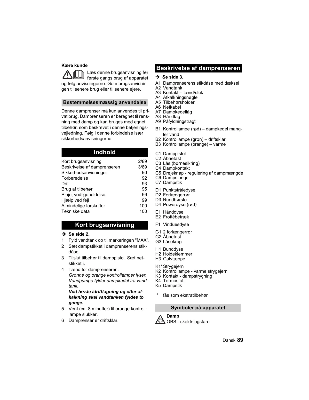 G1 2 forlængerrar G2 Abnetast G3 Läsekrog H1 Bunddyse H2 Holdeklemmer H3 Gulvtæppe Vinduesdyse K1* Strygejern K2 Kontrollampe - varme strygejern K3 Kontakt - dampstrygning K4 Termostat K5 Dampstik fàs som ekstratilbehor Symboler pà apparatet Damp OBS - skoldningsfare Dansk 89