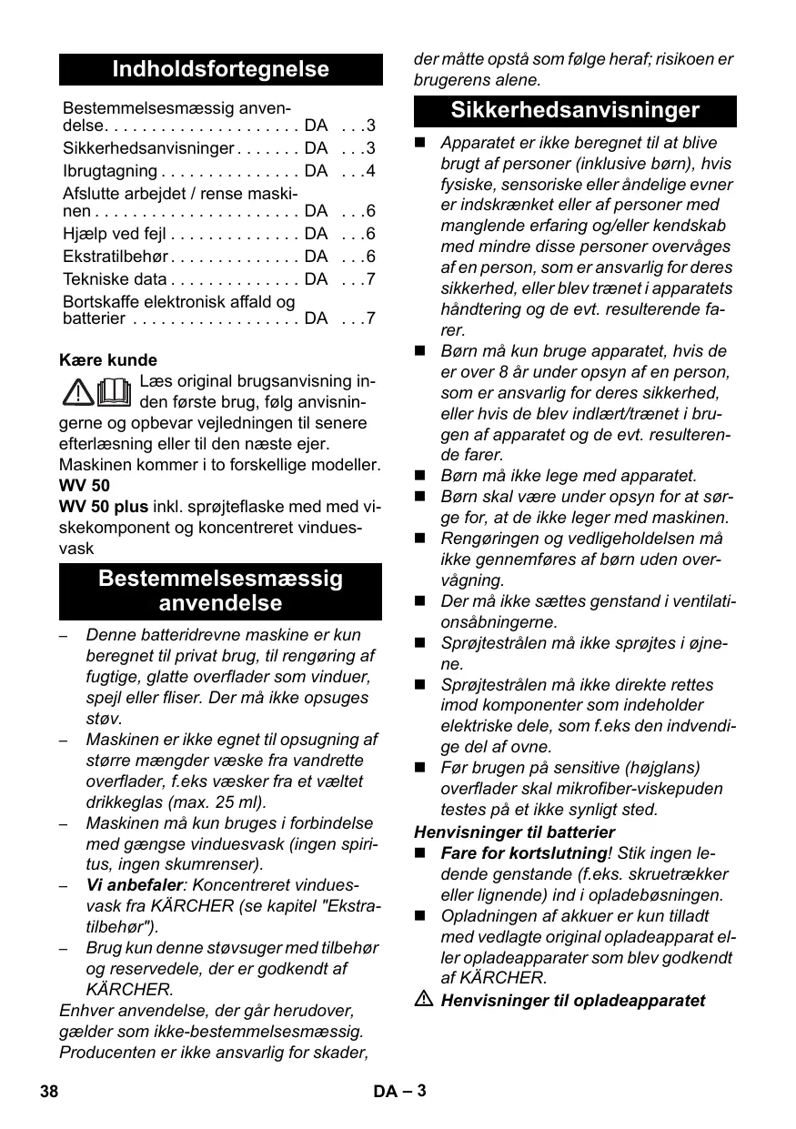 DA . . .7 Kære kunde Læs original brugsanvisning inden første brug, følg anvisningerne og opbevar vejledningen til senere efterlæsning eller til den næste ejer. Maskinen kommer i to forskellige modeller. WV 50 WV 50 plus inkl. sprøjteflaske med med viskekomponent og koncentreret vinduesvask Bestemmelsesmæssig anvendelse Denne batteridrevne maskine er kun beregnet til privat brug, til rengøring af fugtige, glatte overflader som vinduer, spejl eller fliser. Der må ikke opsuges støv. – Maskinen er ikke egnet til opsugning af større mængder væske fra vandrette overflader, f.eks væsker fra et væltet drikkeglas (max. 25 ml). – Maskinen må kun bruges i forbindelse med gængse vinduesvask (ingen spiritus, ingen skumrenser). – Vi anbefaler: Koncentreret vinduesvask fra KÄRCHER (se kapitel "Ekstratilbehør"). – Brug kun denne støvsuger med tilbehør og reservedele, der er godkendt af KÄRCHER. Enhver anvendelse, der går herudover, gælder som ikke-bestemmelsesmæssig. Producenten er ikke ansvarlig for skader,