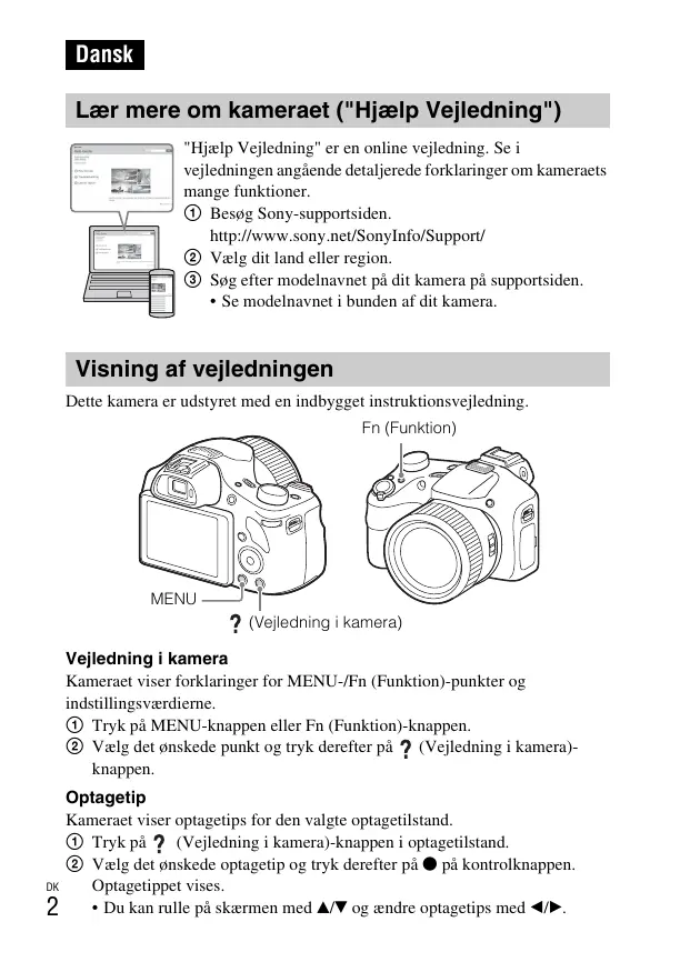 Dansk Lær mere om kameraet ("Hjælp Vejledning") "Hjælp Vejledning" er en online vejledning. Se i vejledningen angående detaljerede forklaringer om kameraets mange funktioner. 1 Besøg Sony-supportsiden. http://www.sony.net/SonyInfo/Support/ 2 Vælg dit land eller region. 3 Søg efter modelnavnet på dit kamera på supportsiden.
