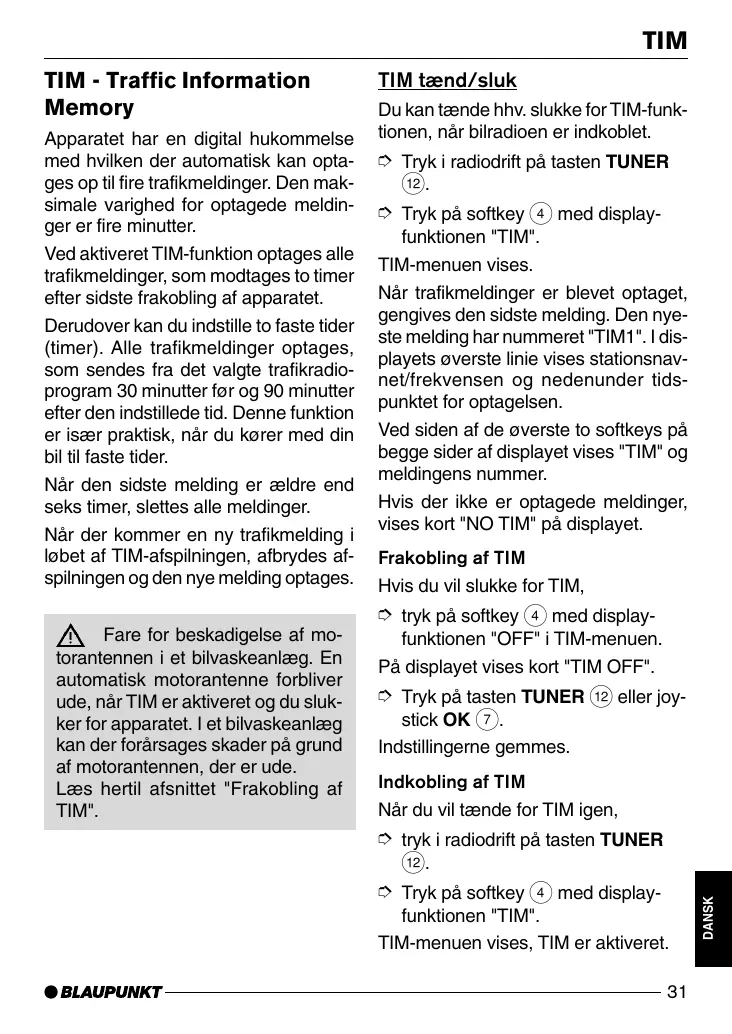 DANSK TIM - Traffic Information Memory . 31 TIM tænd/sluk 31 Afspilning af gemte trafikmeldinger 32 Optagelse af trafikmeldinger 32 Indstilling af timer 32 Valg af timer 33