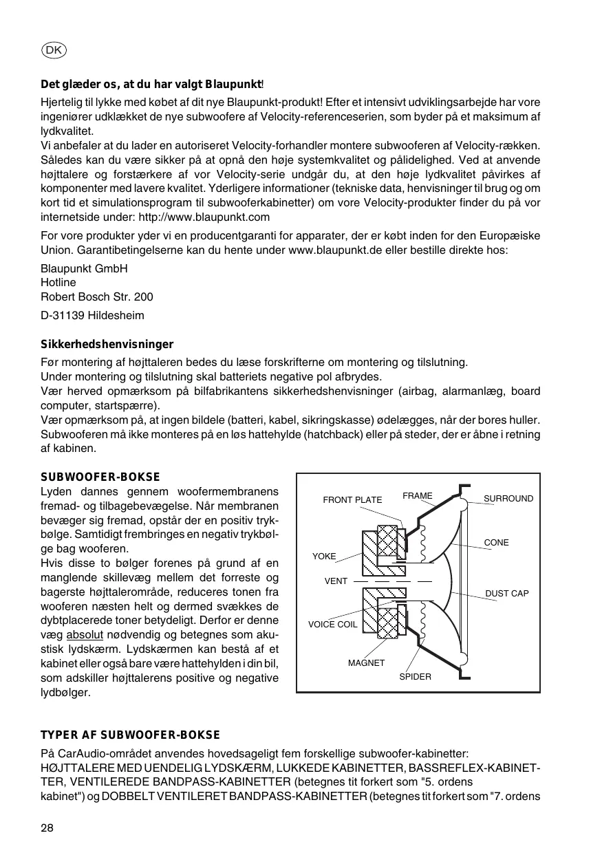 DK Det glæder os, at du har valgt Blaupunkt! Hjertelig til lykke med købet af dit nye Blaupunkt-produkt! Efter et intensivt udviklingsarbejde har vore ingeniører udklækket de nye subwoofere af Velocity-referenceserien, som byder på et maksimum af lydkvalitet. Vi anbefaler at du lader en autoriseret Velocity-forhandler montere subwooferen af Velocity-rækken. Således kan du være sikker på at opnå den høje systemkvalitet og pålidelighed. Ved at anvende højttalere og forstærkere af vor Velocity-serie undgår du, at den høje lydkvalitet påvirkes af komponenter med lavere kvalitet. Yderligere informationer (tekniske data, henvisninger til brug og om kort tid et simulationsprogram til subwooferkabinetter) om vore Velocity-produkter finder du på vor internetside under: http://www.blaupunkt.com For vore produkter yder vi en producentgaranti for apparater, der er købt inden for den Europæiske Union. Garantibetingelserne kan du hente under www.blaupunkt.de eller bestille direkte hos: Blaupunkt GmbH Hotline Robert Bosch Str. 200 D-31139 Hildesheim Sikkerhedshenvisninger Før montering af højttaleren bedes du læse forskrifterne om montering og tilslutning. Under montering og tilslutning skal batteriets negative pol afbrydes. Vær herved opmærksom på bilfabrikantens sikkerhedshenvisninger (airbag, alarmanlæg, board computer, startspærre). Vær opmærksom på, at ingen bildele (batteri, kabel, sikringskasse) ødelægges, når der bores huller. Subwooferen må ikke monteres på en løs hattehylde (hatchback) eller på steder, der er åbne i retning af kabinen. SUBWOOFER-BOKSE Lyden dannes gennem woofermembranens fremad- og tilbagebevægelse. Når membranen bevæger sig fremad, opstår der en positiv trykbølge. Samtidigt frembringes en negativ trykbølge bag wooferen. Hvis disse to bølger forenes på grund af en manglende skillevæg mellem det forreste og bagerste højttalerområde, reduceres tonen fra wooferen næsten helt og dermed svækkes de dybtplacerede toner betydeligt. Derfor er denne væg absolut nødvendig og betegnes som akustisk lydskærm. Lydskærmen kan bestå af et kabinet eller også bare være hattehylden i din bil, som adskiller højttalerens positive og negative lydbølger.