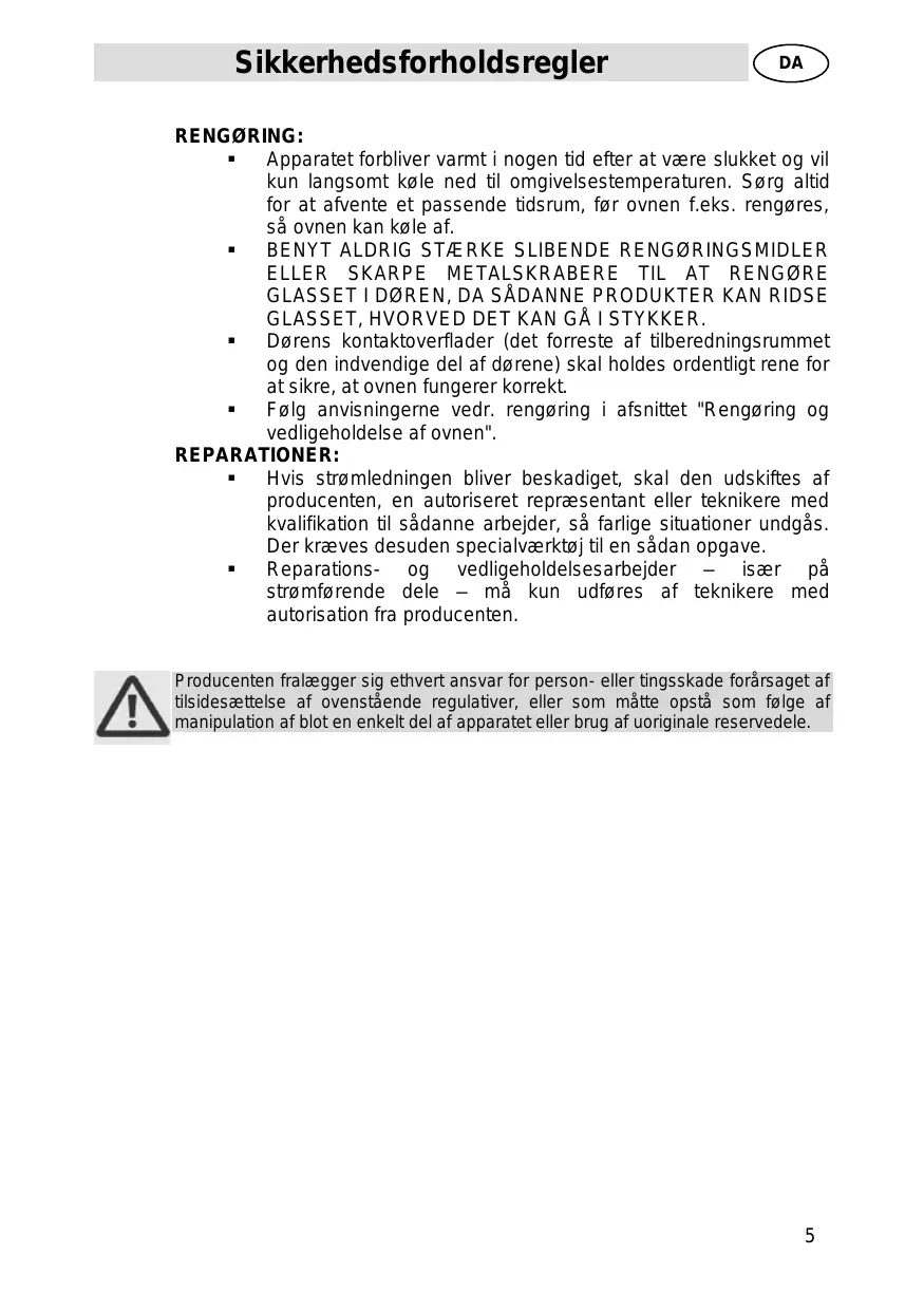 ELLER SKARPE METALSKRABERE TIL AT RENG@RE GLASSET | DYREN, DA SÂDANNE PRODUKTER KAN RIDSE GLASSET, HVORVED DET KAN GÀ I STYKKER. “ Dorens kontaktoverflader (det forreste af tilberedningsrummet og den indvendige del af dgrene) skal holdes ordentligt rene for at sikre, at ovnen fungerer korrekt. “ _Folg anvisningerne vedr. renggring i afsnittet "Renggring og vedligeholdelse af ovnen". REPARATIONER: “_ Hvis stromledningen bliver beskadiget, skal den udskiftes af producenten, en autoriseret repræsentant eller teknikere med kvalifikation til sâdanne arbejder, sà farlige situationer undgäs Der kræves desuden specialværktaj til en sädan opgave. “ Reparations- og vedligeholdelsesarbejder — især pà strümforende dele — mä kun udfgres af teknikere med autorisation fra producenten tilsidesættelse af ovenstäende regulativer, eller som mâtte opstà som folge af Producenten fralægger sig ethvert ansvar for person- eller tingsskade forärsaget af VAN manipulation af blot en enkelt del af apparatet eller brug af uoriginale reservedele.