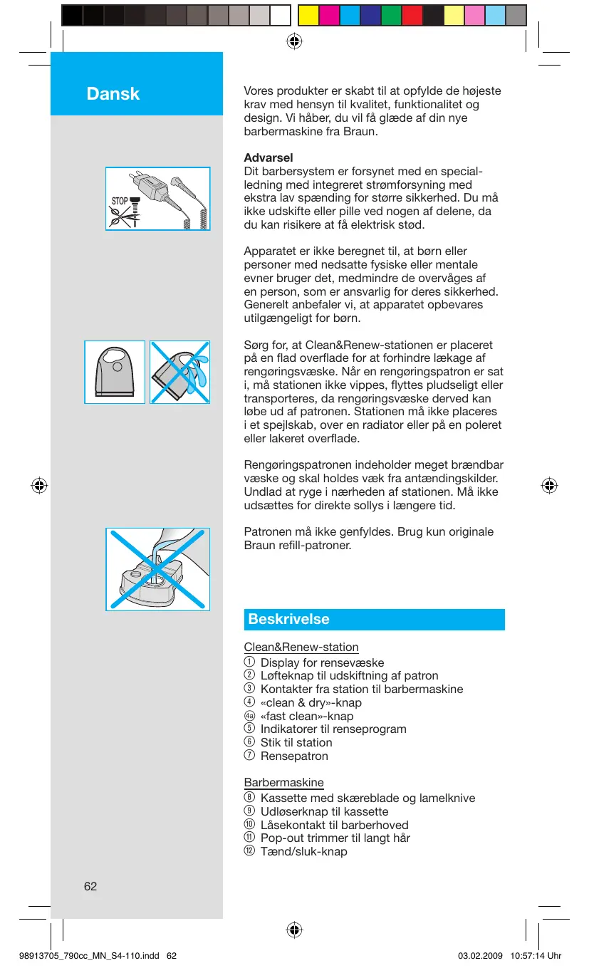Dansk STOP Vores produkter er skabt til at opfylde de højeste krav med hensyn til kvalitet, funktionalitet og design. Vi håber, du vil få glæde af din nye barbermaskine fra Braun. Advarsel Dit barbersystem er forsynet med en specialledning med integreret strømforsyning med ekstra lav spænding for større sikkerhed. Du må ikke udskifte eller pille ved nogen af delene, da du kan risikere at få elektrisk stød. Apparatet er ikke beregnet til, at børn eller personer med nedsatte fysiske eller mentale evner bruger det, medmindre de overvåges af en person, som er ansvarlig for deres sikkerhed. Generelt anbefaler vi, at apparatet opbevares utilgængeligt for børn. Sørg for, at Clean&Renew-stationen er placeret på en flad overflade for at forhindre lækage af rengøringsvæske. Når en rengøringspatron er sat i, må stationen ikke vippes, flyttes pludseligt eller transporteres, da rengøringsvæske derved kan løbe ud af patronen. Stationen må ikke placeres i et spejlskab, over en radiator eller på en poleret eller lakeret overflade. Rengøringspatronen indeholder meget brændbar væske og skal holdes væk fra antændingskilder. Undlad at ryge i nærheden af stationen. Må ikke udsættes for direkte sollys i længere tid. Patronen må ikke genfyldes. Brug kun originale Braun refill-patroner. Beskrivelse Clean&Renew-station 1 Display for rensevæske 2 Løfteknap til udskiftning af patron 3 Kontakter fra station til barbermaskine 4 «clean & dry»-knap D «fast clean»-knap 5 Indikatorer til renseprogram 6 Stik til station 7 Rensepatron Barbermaskine 8 Kassette med skæreblade og lamelknive 9 Udløserknap til kassette 0 Låsekontakt til barberhoved q Pop-out trimmer til langt hår w Tænd/sluk-knap