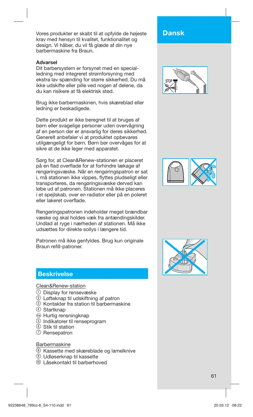 Vores produkter er skabt til at opfylde de højeste krav med hensyn til kvalitet, funktionalitet og design. Vi håber, du vil få glæde af din nye barbermaskine fra Braun. Advarsel Dit barbersystem er forsynet med en specialledning med integreret strømforsyning med ekstra lav spænding for større sikkerhed. Du må ikke udskifte eller pille ved nogen af delene, da du kan risikere at få elektrisk stød. Dansk STOP Brug ikke barbermaskinen, hvis skæreblad eller ledning er beskadigede. Dette produkt er ikke beregnet til at bruges af børn eller svagelige personer uden overvågning af en person der er ansvarlig for deres sikkerhed. Generelt anbefaler vi at produktet opbevares utilgængeligt for børn. Børn bør overvåges for at sikre at de ikke leger med apparatet. Sørg for, at Clean&Renew-stationen er placeret på en flad overflade for at forhindre lækage af rengøringsvæske. Når en rengøringspatron er sat i, må stationen ikke vippes, flyttes pludseligt eller transporteres, da rengøringsvæske derved kan løbe ud af patronen. Stationen må ikke placeres i et spejlskab, over en radiator eller på en poleret eller lakeret overflade. Rengøringspatronen indeholder meget brændbar væske og skal holdes væk fra antændingskilder. Undlad at ryge i nærheden af stationen. Må ikke udsættes for direkte sollys i længere tid. Patronen må ikke genfyldes. Brug kun originale Braun refill-patroner. Beskrivelse Clean&Renew-station 1 Display for rensevæske 2 Løfteknap til udskiftning af patron 3 Kontakter fra station til barbermaskine 4 Startknap D Hurtig rensningknap 5 Indikatorer til renseprogram 6 Stik til station 7 Rensepatron Barbermaskine Kassette med skæreblade og lamelknive Udløserknap til kassette Låsekontakt til barberhoved