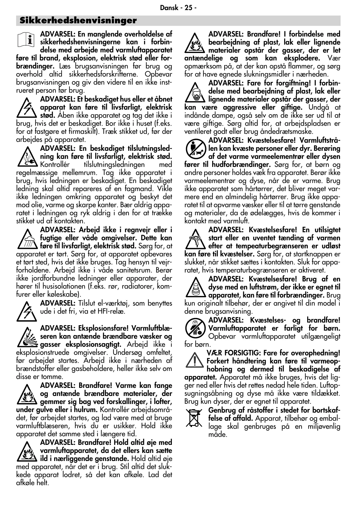 ADVARSEL: Brandfare! I forbindelse med bearbejdning af plast, lak eller lignende materialer opstår der gasser, der er let antændelige og som kan eksplodere. Vær opmærksom på, at der kan opstå flammer, og sørg for at have egnede slukningsmidler i nærheden. ADVARSEL: Fare for forgiftning! I forbindelse med bearbejdning af plast, lak eller lignende materialer opstår der gasser, der kan være aggressive eller giftige. Undgå at indånde dampe, også selv om de ikke ser ud til at være giftige. Sørg altid for, at arbejdspladsen er ventileret godt eller brug åndedrætsmaske. ADVARSEL: Kvæstelsesfare! Varmluftstrålen kan kvæste personer eller dyr. Berøring af det varme varmeelementrør eller dysen fører til hudforbrændinger. Sørg for, at børn og andre personer holdes væk fra apparatet. Berør ikke varmeelementrør og dyse, når de er varme. Brug ikke apparatet som hårtørrer, det bliver meget varmere end en almindelig hårtørrer. Brug ikke apparatet til at opvarme væsker eller til at tørre genstande og materialer, da de ødelægges, hvis de kommer i kontakt med varmluft. ADVARSEL: Kvæstelsesfare! En utilsigtet start eller en uventet tænding af varmen efter at tempeaturbegrænseren er udløst kan føre til kvæstelser. Sørg for, at startknappen er slukket, når stikket sættes i kontakten. Sluk for apparatet, hvis temperaturbegrænseren er aktiveret. ADVARSEL: Kvæstelsesfare! Brug af en dyse med en luftstrøm, der ikke er egnet til apparatet, kan føre til forbrændinger. Brug kun originalt tilbehør, der er angivet til din model i denne brugsanvisning. ADVARSEL: Kvæstelses- og brandfare! Varmluftapparatet er farligt for børn. Opbevar varmluftapparatet utilgængeligt for børn. VÆR FORSIGTIG: Fare for overophedning! Forkert håndtering kan føre til varmeophobning og dermed til beskadigelse af apparatet. Apparatet må ikke bruges, hvis det ligger ned eller hvis det rettes nedad hele tiden. Luftopsugningsåbning og dyse må ikke være tildækket. Brug kun dyser, der er egnet til apparatet. Genbrug af råstoffer i stedet for bortskaffelse af affald. Apparat, tilbehør og emballage skal genbruges på en miljøvenlig måde.