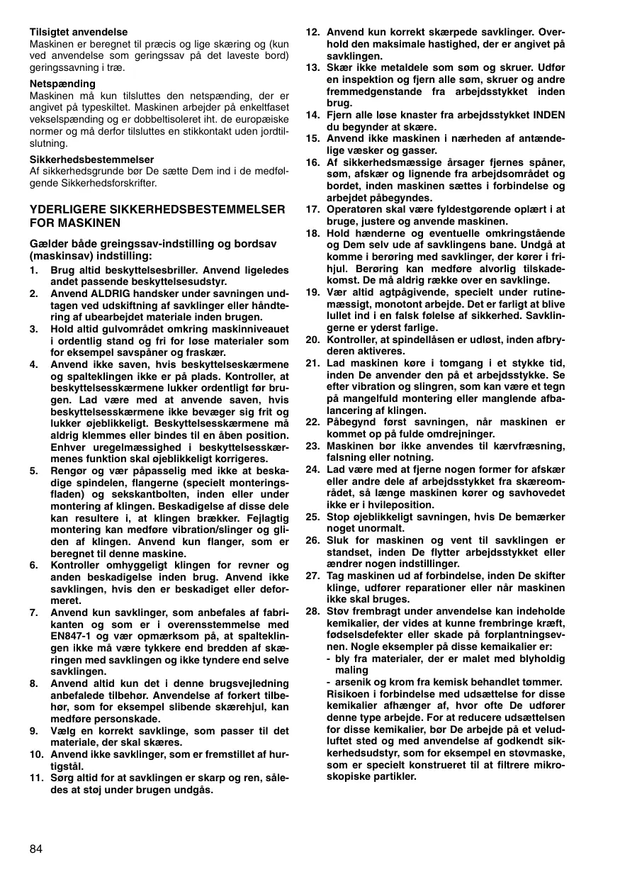 keligt savningen, hvis De bemærker noget unormalt. Sluk for maskinen og vent til savklingen er standset, inden De flytter arbejdsstykket eller ændrer nogen indstillinger. Tag maskinen ud af forbindelse, inden De skifter klinge, udforer reparationer eller nâr maskinen ikke skal bruges. Stov frembragt under anvendelse kan indeholde kemikalier, der vides at kunne frembringe kræft, fodselsdefekter eller skade pâ forplantningsev- nen. Nogle eksempler pà disse kemaikalier er: - bly fra materialer, der er malet med blyholdig maling - arsenik og krom fra kemisk behandllet tommer. Risikoen i forbindelse med udsættelse for disse kemikalier afhænger af, hvor ofte De udforer denne type arbejde. For at reducere udsættelsen for disse kemikalier, bor De arbejde pâ et velud- luftet sted og med anvendelse af godkendt sik- kerhedsudstyr, som for eksempel en stovmaske, som er specielt konstrueret til at filtrere mikro- skopiske partikler.