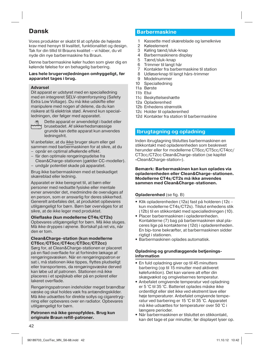 Dansk Vores produkter er skabt til at opfylde de højeste krav med hensyn til kvalitet, funktionalitet og design. Tak for din tillid til Brauns kvalitet – vi håber, du vil nyde din nye barbermaskine fra Braun. Denne barbermaskine køler huden som giver dig en kølende følelse for en behagelig barbering. Læs hele brugervejledningen omhyggeligt, før apparatet tages i brug. Advarsel Dit apparat er udstyret med en specialledning med en integreret SELV-strømforsyning (Safety Extra Low Voltage). Du må ikke udskifte eller manipulere med nogen af delene, da du kan risikere at få elektrisk stød. Anvend kun specialledningen, der følger med apparatet. Dette apparat er anvendeligt i badet eller brusebadet. Af sikkerhedsmæssige grunde kan dette apparat kun anvendes ledningsfrit. Vi anbefaler, at du ikke bruger skum eller gel sammen med barbermaskinen for at sikre, at du – opnår en optimal afkølende effekt. – får den optimale rengøringsydelse fra Clean&Charge-stationen (gælder CC-modeller). – undgår potentiel skade på apparatet. Brug ikke barbermaskinen med et beskadiget skæreblad eller ledning. Apparatet er ikke beregnet til, at børn eller personer med nedsatte fysiske eller mentale evner anvender det, medmindre de overvåges af en person, som er ansvarlig for deres sikkerhed. Generelt anbefales det, at produktet opbevares utilgængeligt for børn. Børn bør overvåges for at sikre, at de ikke leger med produktet. Olieflaske (kun modellerne CT4s/CT2s) Opbevares utilgængeligt for børn. Må ikke sluges. Må ikke dryppes i øjnene. Bortskaf på ret vis, når den er tom. Clean&Charge-station (kun modellerne CT6cc/CT5cc/CT4cc/CT3cc/CT2cc) Sørg for, at Clean&Charge-stationen er placeret på en flad overflade for at forhindre lækage af rengøringsvæsken. Når en rengøringspatron er sat i, må stationen ikke tippes, flyttes pludseligt eller transporteres, da rengøringsvæske derved kan løbe ud af patronen. Stationen må ikke placeres i et spejlskab eller på en poleret eller lakeret overflade. Rengøringspatronen indeholder meget brændbar væske og skal holdes væk fra antændingskilder. Må ikke udsættes for direkte sollys og cigaretrygning eller opbevares over en radiator. Opbevares utilgængeligt for børn. Patronen må ikke genopfyldes. Brug kun originale Braun refill-patroner. Barbermaskine