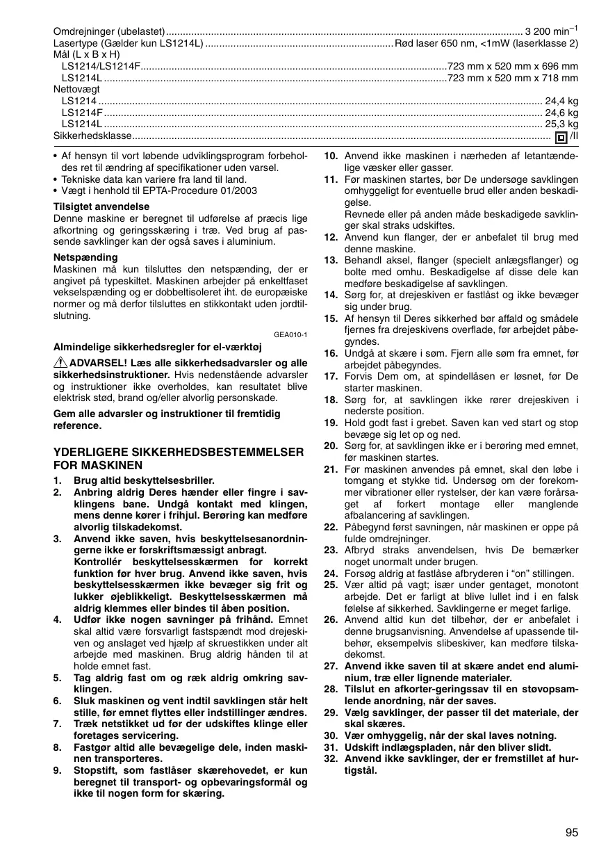 Gælder kun model LS1214L Hvis linsen til laserlyset er blevet snavset, eller huis sav- smuld har sat sig fast pà den pâ en sâdan mâde, at laserlnien ikke længere er synlig, skal De tage maskinen ud af forbindelse og rengore laserlyset omhyggeligt med en bled, fugtig klud. Der mà ikke anvendes oplosnings- midler eller petroleumsbaserede rengaringsmidier til ren- goring af linsen.