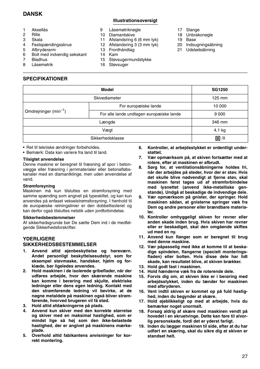 1 Akselläs 9 Läsemotriknogle 17 Slange 2 ile 10 Diamantskive 18. Unbrakonogle 3 Skala 11 Afstandsring 6 (6 mm tyk) 19 Base 4 Fastspændingsskrue 12. Afstandsring 3 (3 mm tÿk) 20 Indsugningsäbning 5 Afbryderarm 13. Fronthändtag 21 Udstodsäbning 6 Bolt med indvendig sekskant 14 Kam 7. Bladhus 15. Stovsugermundstykke 8 Läsemotrik 16 Stovsuger SPECIFIKATIONER Model SG1250 Skivediameter 125 mm For europæiske lande 10 000 Omdrejninger (min For alle lande undtagen europæiske lande 9 000 Længde 346 mm Vægt A1 kg Sikkerhedsklasse CII