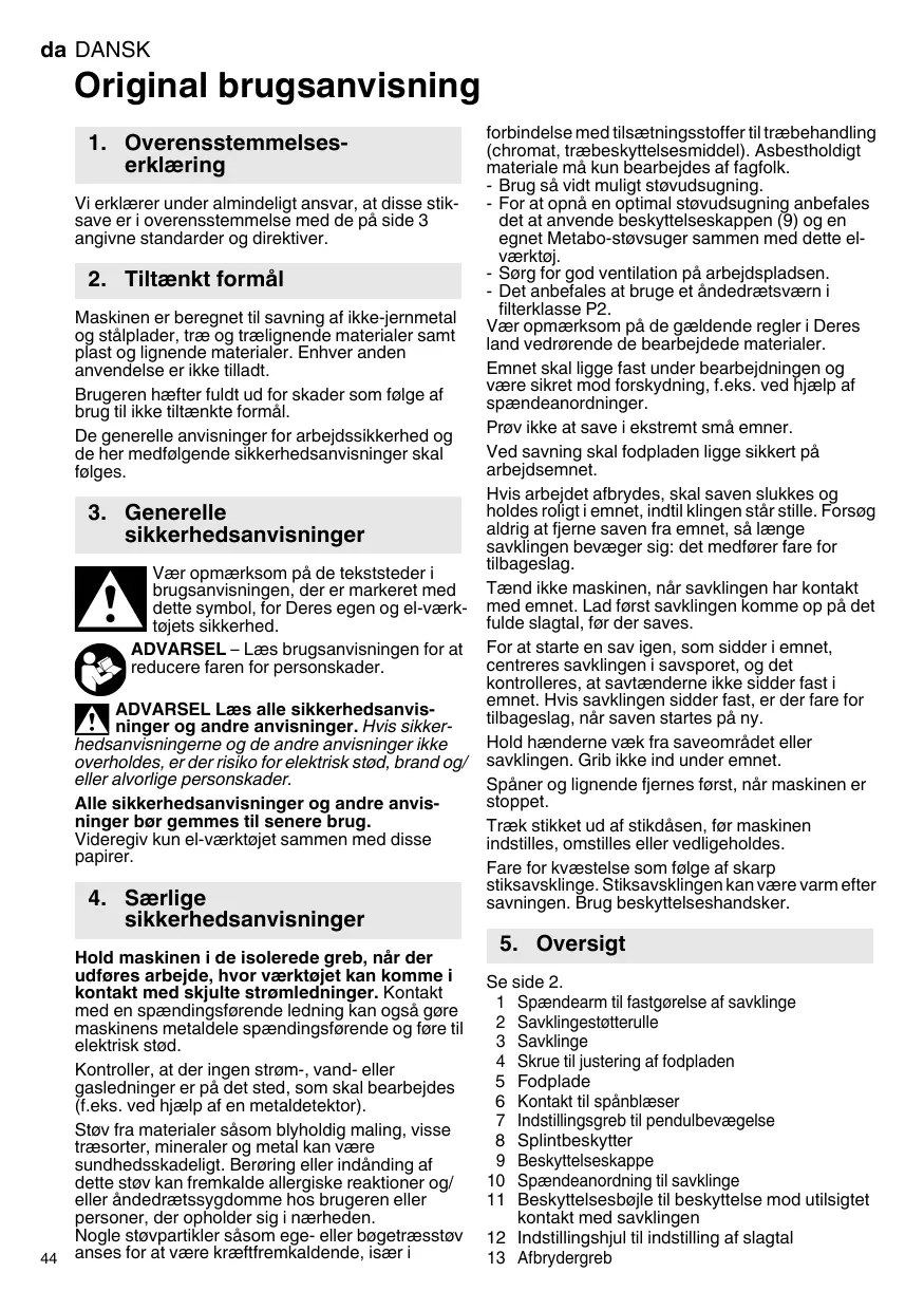 Maskinen er beregnet til savning af ikke-jemmetal og slélplader, æ og tælignende materaler sat plast og lignende materialer. Enhver anden anvendelse er ikke tillaci. Brugeren hæfter fuldt ud for skader som folge af brug til ikke tiltænkte formäl. De generelle anvisninger for arbejdssikkerhed og de her medfalgende sikkerhedsanvisninger skal folges.