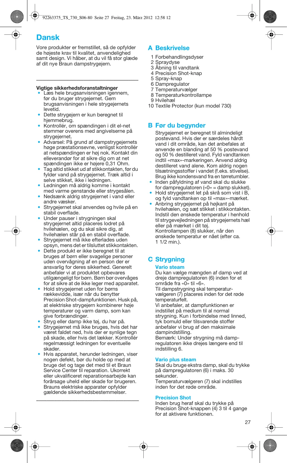 92263375_TS_730_S06-80 Seite 28 Freitag, 23. März 2012 12:58 12 Tryk på Precision Shot-knappen med mellemrum på mindst 5 sekunder for at få et kraftigt dampskud med forbehandlingsdamp. Precision Shot kan aktiveres ved strygning uden damp. Men temperaturvælgeren skal indstilles inden for det røde område. Dampskud funktionen kan også anvendes i opret stilling til dampning af ophængt tøj. Advarsel: Der kommer varm damp ud af forbehandlingsdyserne. Sprayfunktion Tryk på sprayknappen (5). Strygning uden damp Drej dampregulatoren (6) til stillingen «0» (= damp slukket). D Textile Protector (kun model 730) Før tekstilsålen (10) påsættes første gang, bør strygejernet bruges ca. 2 minutter uden tekstilsål. Braun Textile Protector beskytter sart tøj/stof imod varmeskader og gør det muligt at stryge det meste mørke tøj uden brug af mellemliggende strygeklæde. Takket være en særlig coating undgås skinnende områder. For ikke at beskadige denne coating skal du undgå at stryge over f.eks. lynlåse, metalknapper/nitter eller strass med påsat Textile Protector. For at teste stoffets reaktion, før du begynder at stryge, anbefaler vi, at du stryger et lille stykke på stoffets bagside. Med Textile Protector kan du stryge sarte tekstiler med temperaturindstilling inden for det røde område, så du kan bruge alle de dampfunktioner, dit strygejern tilbyder. Efter montering af Braun Textile Protector bør du vente ca. 1 1/2 minut, før du tænder for strygejernet. Opbevar altid strygejernet og Textile Protectoren adskilt. E Efter strygning Tag stikket ud af stikkontakten, og drej dampregulatoren til indstilling «0». Tøm vandtanken for at forlænge strygejernets levetid. Opbevar det afkølede strygejern på et tørt sted, og lad det altid stå lodret på hvilehælen. F Vedligeholdelse og rengøring Til rengøring af strygesålen anvendes ståluld. Brug aldrig skurepulver, eddike eller kemikalier af nogen art.
