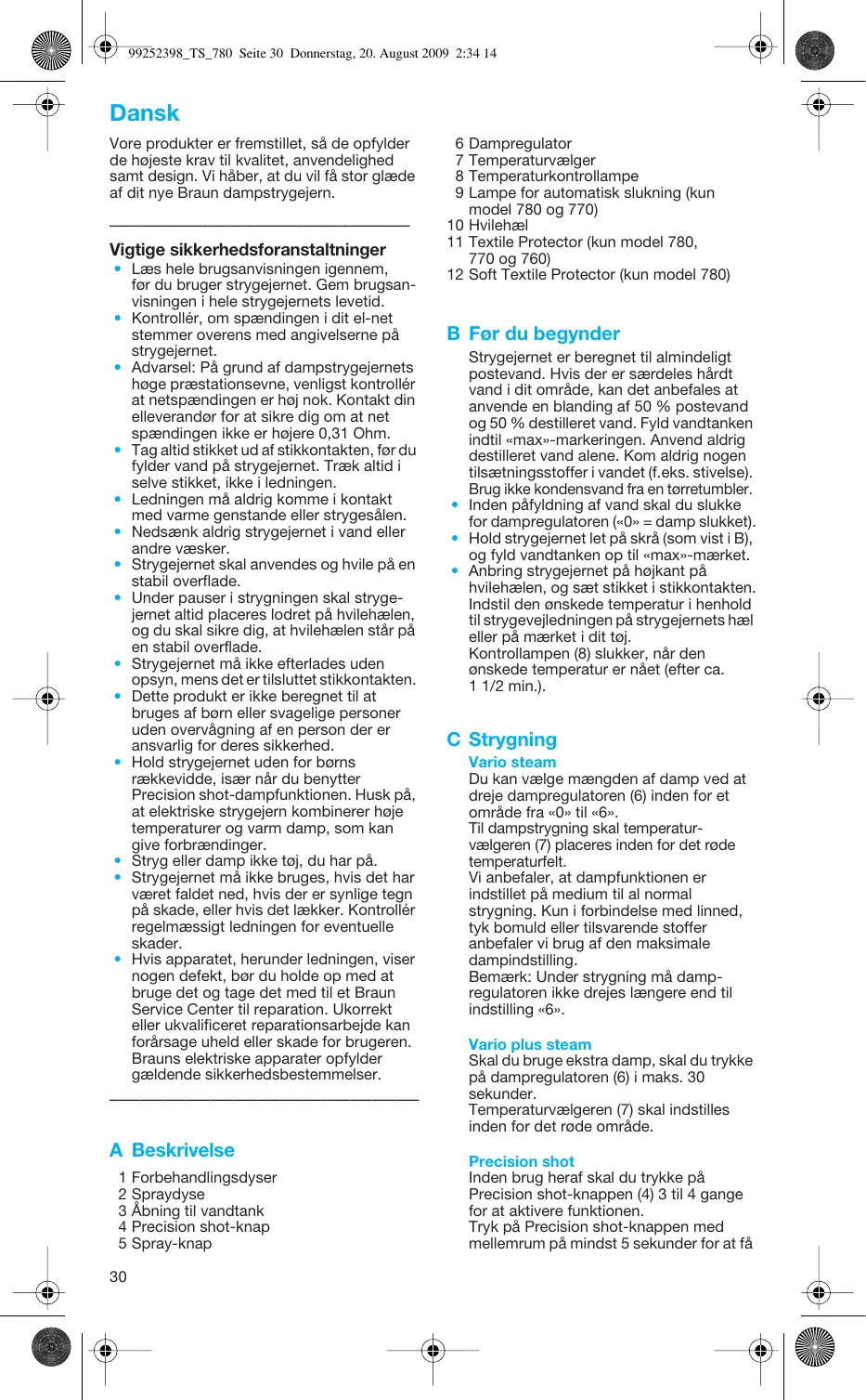 Vore Produkter er fremstillet, sá de opfylder de hójeste krav til kvalitet, anvendelighed samt design. Vi haber, at du vil fà stor glæde af dit nye Braun dampstrygejern.
