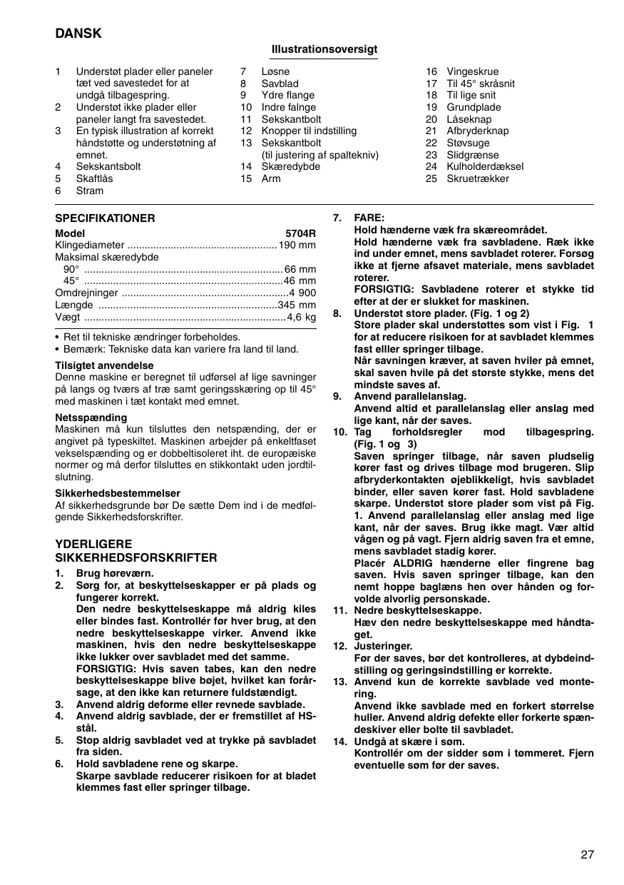 Brug høreværn. Sørg for, at beskyttelseskapper er på plads og fungerer korrekt. Den nedre beskyttelseskappe må aldrig kiles eller bindes fast. Kontrollér før hver brug, at den nedre beskyttelseskappe virker. Anvend ikke maskinen, hvis den nedre beskyttelseskappe ikke lukker over savbladet med det samme. FORSIGTIG: Hvis saven tabes, kan den nedre beskyttelseskappe blive bøjet, hvilket kan forårsage, at den ikke kan returnere fuldstændigt. Anvend aldrig deforme eller revnede savblade. Anvend aldrig savblade, der er fremstillet af HSstål. Stop aldrig savbladet ved at trykke på savbladet fra siden. Hold savbladene rene og skarpe. Skarpe savblade reducerer risikoen for at bladet klemmes fast eller springer tilbage.