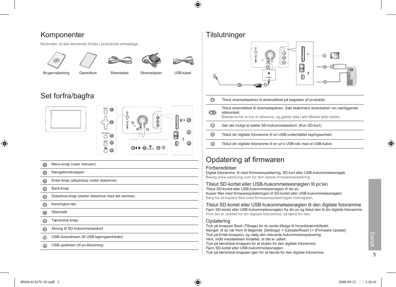 Tilslut strømstikket til strømadapteren. Sæt skærmens strømkabel i en nærliggende stikkontakt. Billederne her er kun til reference, og gælder ikke i alle tilfælde (eller lande). Tilslut din digitale fotoramme til en USB-understøttet lagringsenhed. Tilslut din digitale fotoramme til en pc’s USB-stik med et USB-kabel. Opdatering af firmwaren Forberedelser Digital fotoramme, fil med firmwareopdatering, SD-kort eller USB-hukommelsesnøgle Besøg www.samsung.com for den nyeste firmwareopdatering. Tilslut SD-kortet eller USB-hukommelsesnøglen til pc'en Diasshow-knap (starter diasshow med det samme) Tilslut SD-kortet eller USB-hukommelsesnøglen til din pc Kopier filen med firmwareopdateringen til SD-kortet eller USB-hukommelsesnøglen. Sørg for at kopiere filen med firmwareopdateringen rodmappen. Kensington-lås Tilslut SD-kortet eller USB-hukommelsesnøglen til den digitale fotoramme Strømstik Fjern SD-kortet eller USB-hukommelsesnøglen fra din pc og tilslut den til din digitale fotoramme. Hvis der er slukket for din digitale fotoramme, så tænd for den. Tænd/sluk-knap Opdatering Åbning til SD-hukommelseskort USB-upstream (til pc-tilslutning) BN68-01567C-03.indb 5 Dansk USB-downstream (til USB-lagringsenheder) Tryk på knappen Back (Tilbage) for at vende tilbage til hovedskærmbilledet. Naviger, til du når frem til følgende: [Settings] -> [Update/Reset ]-> [Firmware Update] Tryk på Enter-knappen, og vælg den relevante hukommelsesplacering. Vent, indtil meddelelsen fortæller, at det er udført. Tryk på tænd/sluk-knappen for at slukke for den digitale fotoramme. Fjern SD-kortet eller USB-hukommelsesnøglen. Tryk på tænd/sluk-knappen igen for at tænde for den digitale fotoramme.
