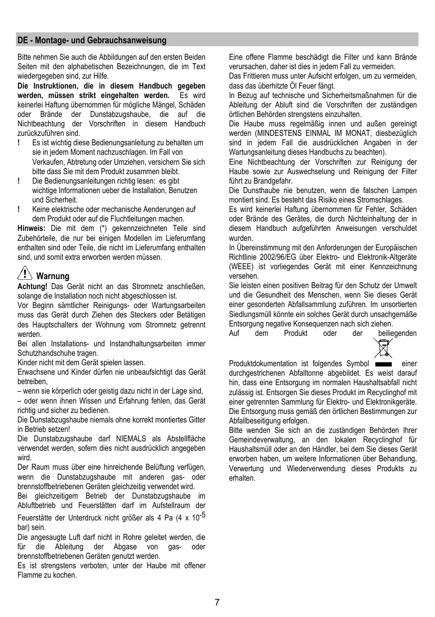 Eine offene Flamme beschädigt die Filter und kann Brände verursachen, daher ist dies in jedem Fall zu vermeiden. Das Frittieren muss unter Aufsicht erfolgen, um zu vermeiden, dass das überhitzte Öl Feuer fängt. In Bezug auf technische und Sicherheitsmaßnahmen für die Ableitung der Abluft sind die Vorschriften der zuständigen örtlichen Behörden strengstens einzuhalten. Die Haube muss regelmäßig innen und außen gereinigt werden (MINDESTENS EINMAL IM MONAT, diesbezüglich sind in jedem Fall die ausdrücklichen Angaben in der Wartungsanleitung dieses Handbuchs zu beachten). Eine Nichtbeachtung der Vorschriften zur Reinigung der Haube sowie zur Auswechselung und Reinigung der Filter führt zu Brandgefahr. Die Dunsthaube nie benutzen, wenn die falschen Lampen montiert sind. Es besteht das Risiko eines Stromschlages. Es wird keinerlei Haftung übernommen für Fehler, Schäden oder Brände des Gerätes, die durch Nichteinhaltung der in diesem Handbuch aufgeführten Anweisungen verschuldet wurden. In Übereinstimmung mit den Anforderungen der Europäischen Richtlinie 2002/96/EG über Elektro- und Elektronik-Altgeräte (WEEE) ist vorliegendes Gerät mit einer Kennzeichnung versehen. Sie leisten einen positiven Beitrag für den Schutz der Umwelt und die Gesundheit des Menschen, wenn Sie dieses Gerät einer gesonderten Abfallsammlung zuführen. Im unsortierten Siedlungsmüll könnte ein solches Gerät durch unsachgemäße Entsorgung negative Konsequenzen nach sich ziehen. Auf dem Produkt oder der beiliegenden