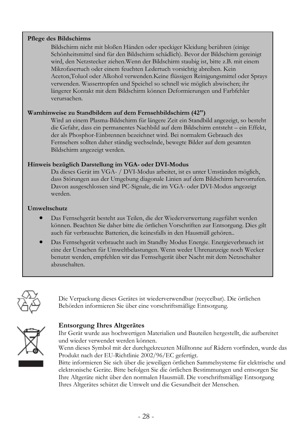 Pflege des Bildschirms Bildschirm nicht mit bloßen Händen oder speckiger Kleidung berühren (einige Schönheitsmittel sind für den Bildschirm schädlich). Bevor der Bildschirm gereinigt wird, den Netzstecker ziehen.Wenn der Bildschirm staubig ist, bitte z.B. mit einem Mikrofasertuch oder einem feuchten Ledertuch vorsichtig abreiben. Kein Aceton,Toluol oder Alkohol verwenden.Keine flüssigen Reinigungsmittel oder Sprays verwenden. Wassertropfen und Speichel so schnell wie möglich abwischen; ihr längerer Kontakt mit dem Bildschirm können Deformierungen und Farbfehler verursachen. Warnhinweise zu Standbildern auf dem Fernsehbildschirm (42") Wird an einem Plasma-Bildschirm für längere Zeit ein Standbild angezeigt, so besteht die Gefahr, dass ein permanentes Nachbild auf dem Bildschirm entsteht – ein Effekt, der als Phosphor-Einbrennen bezeichnet wird. Bei normalem Gebrauch des Fernsehers sollten daher ständig wechselnde, bewegte Bilder auf dem gesamten Bildschirm angezeigt werden. Hinweis bezüglich Darstellung im VGA- oder DVI-Modus Da dieses Gerät im VGA- / DVI-Modus arbeitet, ist es unter Umständen möglich, dass Störungen aus der Umgebung diagonale Linien auf dem Bildschirm hervorrufen. Davon ausgeschlossen sind PC-Signale, die im VGA- oder DVI-Modus angezeigt werden. Umweltschutz