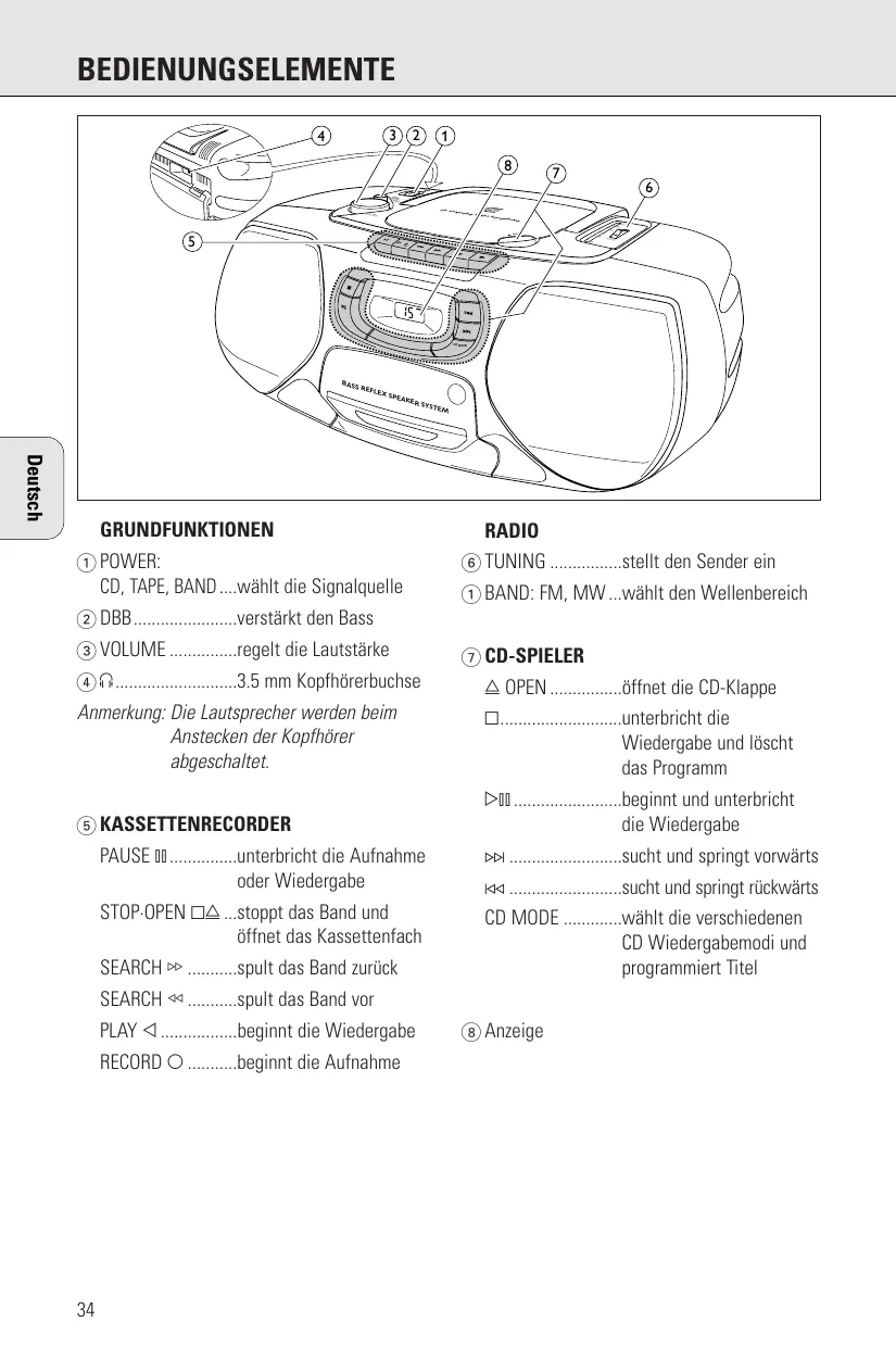 CD MODE B ASS REFL EX SP EAK ER SY STEM Deutsch GRUNDFUNKTIONEN 1 POWER: CD, TAPE, BAND ....wählt die Signalquelle RADIO 6 TUNING ................stellt den Sender ein 1 BAND: FM, MW ...wählt den Wellenbereich 2 DBB.......................verstärkt den Bass 3 VOLUME ...............regelt die Lautstärke 7 CD-SPIELER 4 p...........................3.5 mm Kopfhörerbuchse / OPEN ................öffnet die CD-Klappe Anmerkung: Die Lautsprecher werden beim Anstecken der Kopfhörer abgeschaltet. 9...........................unterbricht die Wiedergabe und löscht das Programm 5 KASSETTENRECORDER 2; ........................beginnt und unterbricht die Wiedergabe PAUSE ; ...............unterbricht die Aufnahme oder Wiedergabe § .........................sucht und springt vorwärts STOP·OPEN 9/ ...stoppt das Band und öffnet das Kassettenfach CD MODE .............wählt die verschiedenen CD Wiedergabemodi und programmiert Titel SEARCH 6 ...........spult das Band zurück ∞ .........................sucht und springt rückwärts SEARCH 5 ...........spult das Band vor PLAY 1 .................beginnt die Wiedergabe RECORD 0 ...........beginnt die Aufnahme