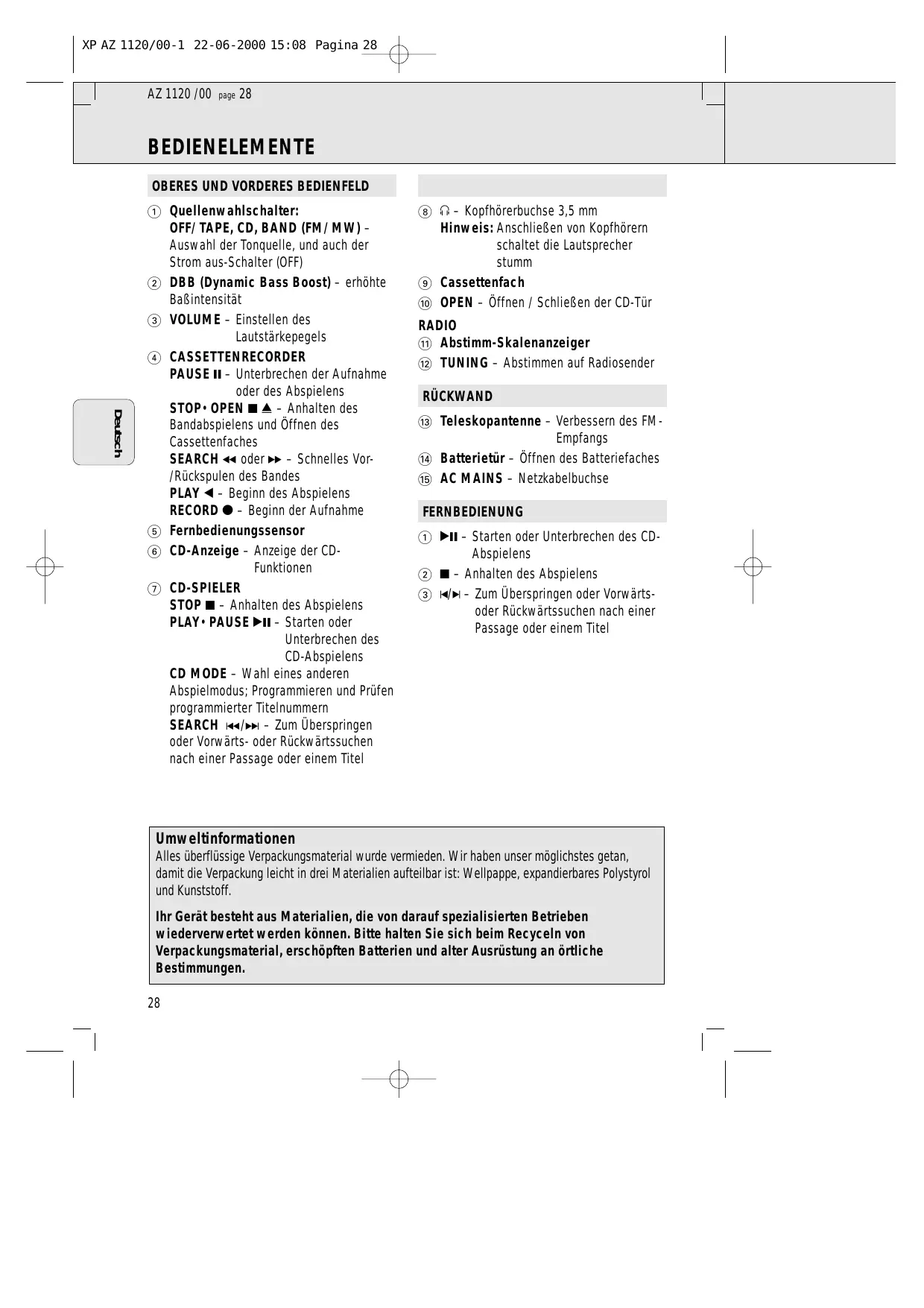 Auswahl der Tonquelle, und auch der Strom aus-Schalter (OFF) 2 DBB (Dynamic Bass Boost) – erhöhte Baßintensität 3 VOLUME – Einstellen des Lautstärkepegels 4 CASSETTENRECORDER PAUSE ; – Unterbrechen der Aufnahme oder des Abspielens STOP•OPEN 9 / – Anhalten des Bandabspielens und Öffnen des Cassettenfaches SEARCH 5 oder 6 – Schnelles Vor/Rückspulen des Bandes PLAY 1 – Beginn des Abspielens RECORD 0 – Beginn der Aufnahme 5 Fernbedienungssensor 6 CD-Anzeige – Anzeige der CDFunktionen 7 CD-SPIELER STOP 9 – Anhalten des Abspielens PLAY•PAUSE 2; – Starten oder Unterbrechen des CD-Abspielens CD MODE – Wahl eines anderen Abspielmodus; Programmieren und Prüfen programmierter Titelnummern SEARCH ∞/§ – Zum Überspringen oder Vorwärts- oder Rückwärtssuchen nach einer Passage oder einem Titel 8 p – Kopfhörerbuchse 3,5 mm Hinweis: Anschließen von Kopfhörern schaltet die Lautsprecher stumm 9 Cassettenfach 0 OPEN – Öffnen / Schließen der CD-Tür RADIO ! Abstimm-Skalenanzeiger @ TUNING – Abstimmen auf Radiosender RÜCKWAND # Teleskopantenne – Verbessern des FMEmpfangs $ Batterietür – Öffnen des Batteriefaches % AC MAINS – Netzkabelbuchse FERNBEDIENUNG 1 2; – Starten oder Unterbrechen des CDAbspielens 2 9 – Anhalten des Abspielens 3 J/K – Zum Überspringen oder Vorwärtsoder Rückwärtssuchen nach einer Passage oder einem Titel Umweltinformationen Alles überflüssige Verpackungsmaterial wurde vermieden. Wir haben unser möglichstes getan, damit die Verpackung leicht in drei Materialien aufteilbar ist: Wellpappe, expandierbares Polystyrol und Kunststoff. Ihr Gerät besteht aus Materialien, die von darauf spezialisierten Betrieben wiederverwertet werden können. Bitte halten Sie sich beim Recyceln von Verpackungsmaterial, erschöpften Batterien und alter Ausrüstung an örtliche Bestimmungen.