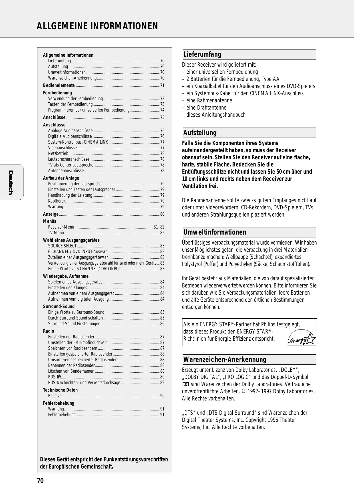 □□ sind Warenzeichen der Dolby Laboratories. Vertrauliche unveröffentlichte Arbeiten. © 1992-1997 Dolby Laboratories. Alle Rechte vorbehalten.