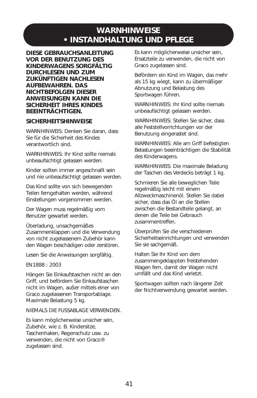 Ne pas suspendre de sacs à provisions à la poignée et ne pas les transporter sur la poussette, sauf sur un plateau à provisions approuvé par Graco. Charge maximum 5 kg. JAMAIS SUR LE REPOSE-PIED. Il peut être dangereux d’utiliser des accessoires tels que des sièges d’enfant, des crochets pour sac ou des protections pour la pluie autres que ceux qui ont été approuvés par Graco®. Il peut être dangereux d’utiliser des pièces de rechange autres que celles qui ont été approuvées par Graco.