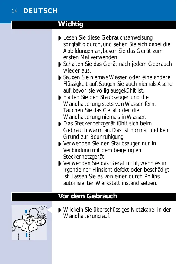 DEUTSCH Wichtig ◗ Lesen Sie diese Gebrauchsanweisung sorgfältig durch, und sehen Sie sich dabei die Abbildungen an, bevor Sie das Gerät zum ersten Mal verwenden. ◗ Schalten Sie das Gerät nach jedem Gebrauch wieder aus. ◗ Saugen Sie niemals Wasser oder eine andere Flüssigkeit auf. Saugen Sie auch niemals Asche auf, bevor sie völlig ausgekühlt ist. ◗ Halten Sie den Staubsauger und die Wandhalterung stets von Wasser fern. Tauchen Sie das Gerät oder die Wandhalterung niemals in Wasser. ◗ Das Steckernetzgerät fühlt sich beim Gebrauch warm an. Das ist normal und kein Grund zur Beunruhigung. ◗ Verwenden Sie den Staubsauger nur in Verbindung mit dem beigefügten Steckernetzgerät. ◗ Verwenden Sie das Gerät nicht, wenn es in irgendeiner Hinsicht defekt oder beschädigt ist. Lassen Sie es von einer durch Philips autorisierten Werkstatt instand setzen.