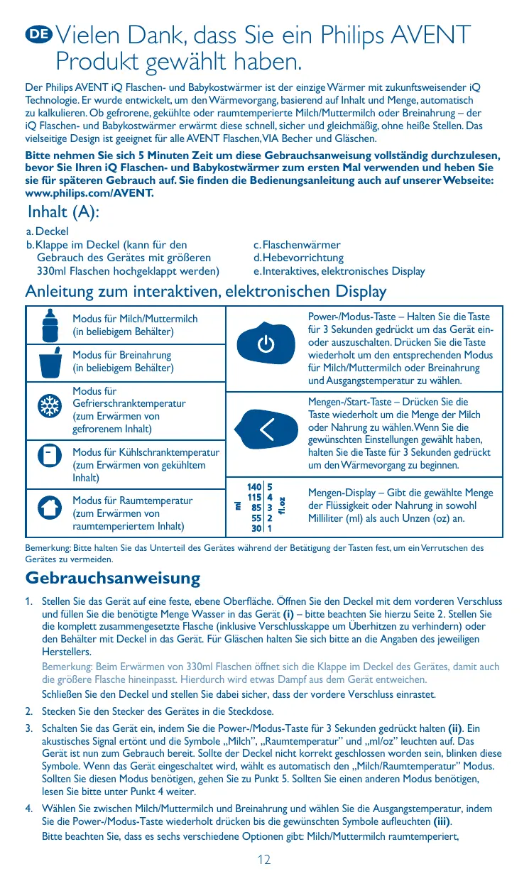Vielen Dank, dass Sie ein Philips AVENT Produkt gewählt haben. Der Philips AVENT iQ Flaschen- und Babykostwärmer ist der einzige Wärmer mit zukunftsweisender iQ Technologie. Er wurde entwickelt, um den Wärmevorgang, basierend auf Inhalt und Menge, automatisch zu kalkulieren. Ob gefrorene, gekühlte oder raumtemperierte Milch/Muttermilch oder Breinahrung – der iQ Flaschen- und Babykostwärmer erwärmt diese schnell, sicher und gleichmäßig, ohne heiße Stellen. Das vielseitige Design ist geeignet für alle AVENT Flaschen,VIA Becher und Gläschen. Bitte nehmen Sie sich 5 Minuten Zeit um diese Gebrauchsanweisung vollständig durchzulesen, bevor Sie Ihren iQ Flaschen- und Babykostwärmer zum ersten Mal verwenden und heben Sie sie für späteren Gebrauch auf. Sie finden die Bedienungsanleitung auch auf unserer Webseite: www.philips.com/AVENT. Inhalt (A): a. Deckel b. Klappe im Deckel (kann für den Gebrauch des Gerätes mit größeren 330ml Flaschen hochgeklappt werden) c. Flaschenwärmer d. Hebevorrichtung e. Interaktives, elektronisches Display Anleitung zum interaktiven, elektronischen Display Power-/Modus-Taste – Halten Sie die Taste für 3 Sekunden gedrückt um das Gerät einoder auszuschalten. Drücken Sie die Taste wiederholt um den entsprechenden Modus für Milch/Muttermilch oder Breinahrung und Ausgangstemperatur zu wählen. Modus für Milch/Muttermilch (in beliebigem Behälter) Modus für Breinahrung (in beliebigem Behälter) Modus für Raumtemperatur (zum Erwärmen von raumtemperiertem Inhalt)