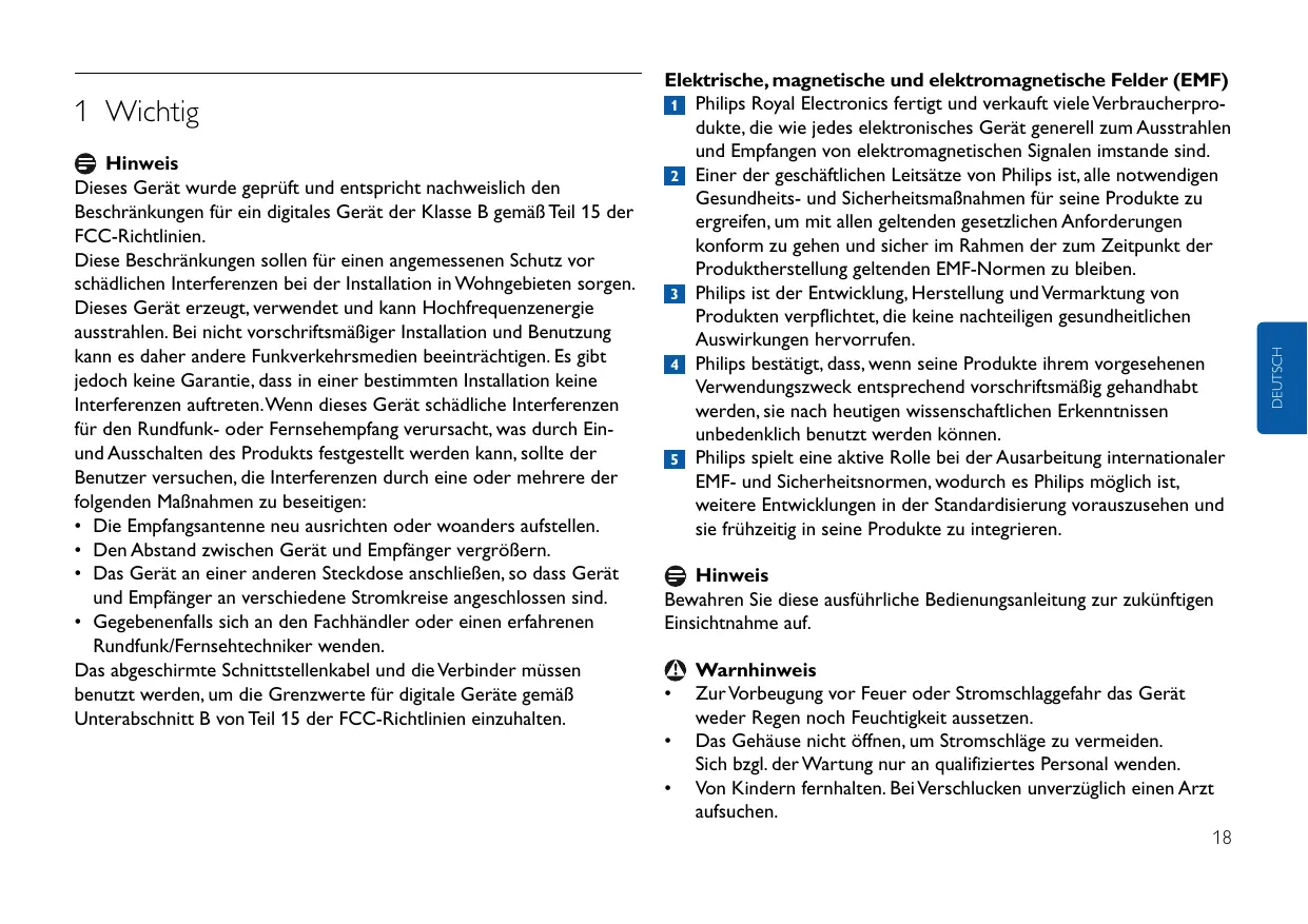2 Einer der geschäftlichen Leitsätze von Philips ist, alle notwendigen Gesundheits- und Sicherheitsmaßnahmen für seine Produkte zu ergreifen, um mit allen geltenden gesetzlichen Anforderungen konform zu gehen und safer im Rahmen der zum Zeitpunkt der Produktherstellung geltenden EMF-Normen zu bleiben.