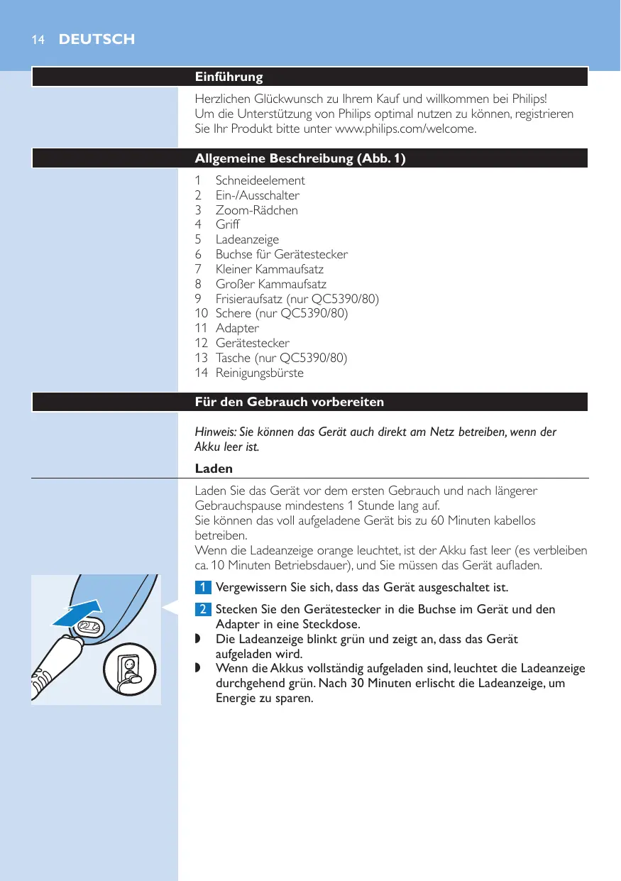 Schneideelement Ein-/Ausschalter Zoom-Rädchen Griff Ladeanzeige Buchse für Gerätestecker Kleiner Kammaufsatz Großer Kammaufsatz Frisieraufsatz (nur QC5390/80) Schere (nur QC5390/80) Adapter Gerätestecker Tasche (nur QC5390/80) Reinigungsbürste Für den Gebrauch vorbereiten Hinweis: Sie können das Gerät auch direkt am Netz betreiben, wenn der Akku leer ist. Laden Laden Sie das Gerät vor dem ersten Gebrauch und nach längerer Gebrauchspause mindestens 1 Stunde lang auf. Sie können das voll aufgeladene Gerät bis zu 60 Minuten kabellos betreiben. Wenn die Ladeanzeige orange leuchtet, ist der Akku fast leer (es verbleiben ca. 10 Minuten Betriebsdauer), und Sie müssen das Gerät aufladen. 1 Vergewissern Sie sich, dass das Gerät ausgeschaltet ist. 2 Stecken Sie den Gerätestecker in die Buchse im Gerät und den Adapter in eine Steckdose. ,, Die Ladeanzeige blinkt grün und zeigt an, dass das Gerät aufgeladen wird. ,, Wenn die Akkus vollständig aufgeladen sind, leuchtet die Ladeanzeige durchgehend grün. Nach 30 Minuten erlischt die Ladeanzeige, um Energie zu sparen. Deutsch