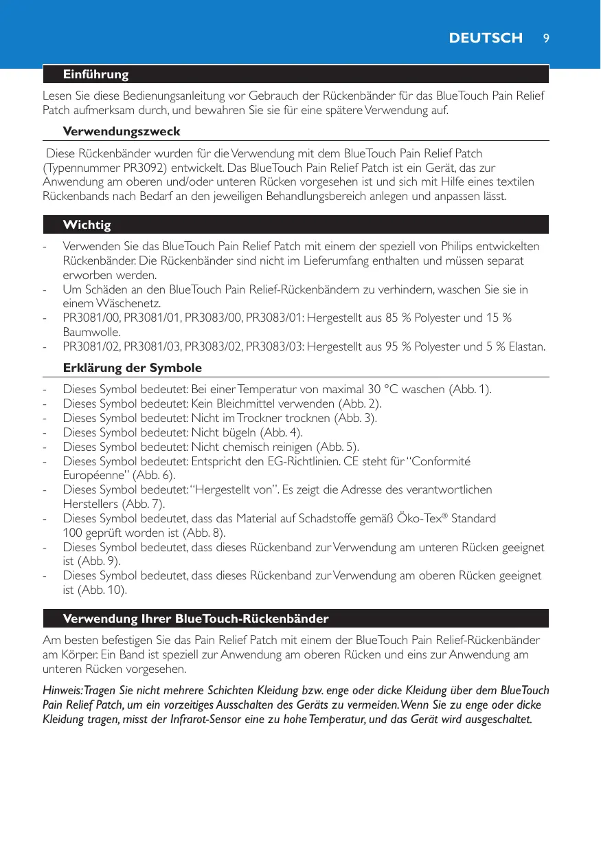 Einführung Lesen Sie diese Bedienungsanleitung vor Gebrauch der Rückenbänder für das BlueTouch Pain Relief Patch aufmerksam durch, und bewahren Sie sie für eine spätere Verwendung auf. Verwendungszweck Diese Rückenbänder wurden für die Verwendung mit dem BlueTouch Pain Relief Patch (Typennummer PR3092) entwickelt. Das BlueTouch Pain Relief Patch ist ein Gerät, das zur Anwendung am oberen und/oder unteren Rücken vorgesehen ist und sich mit Hilfe eines textilen Rückenbands nach Bedarf an den jeweiligen Behandlungsbereich anlegen und anpassen lässt. Wichtig -- Verwenden Sie das BlueTouch Pain Relief Patch mit einem der speziell von Philips entwickelten Rückenbänder. Die Rückenbänder sind nicht im Lieferumfang enthalten und müssen separat erworben werden. -- Um Schäden an den BlueTouch Pain Relief-Rückenbändern zu verhindern, waschen Sie sie in einem Wäschenetz. -- PR3081/00, PR3081/01, PR3083/00, PR3083/01: Hergestellt aus 85 % Polyester und 15 % Baumwolle. -- PR3081/02, PR3081/03, PR3083/02, PR3083/03: Hergestellt aus 95 % Polyester und 5 % Elastan. Erklärung der Symbole