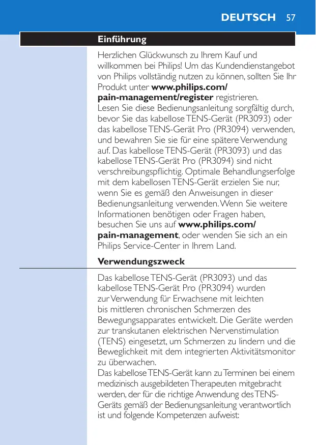 Herzlichen Glückwunsch zu Ihrkauf und willkommen bei Philips! Um das Kundendienstangebot von Philips vollständig nutzen zu konnen, sollen den Sie Ihr Produkt unter www.philips.com/ pain-management/register registrieren. Lesen Sie diese Bedienungsanleitung sorgfältig durch, bevor Sie das kabellose TENS-Gerät (PR3093) oder das kabellose TENS-Gerät Pro (PR3094) verwenden, und bewahren Sie sie für eine spätere Verwendung auf. Das kabellose TENS-Gerät (PR3093) und das kabellose TENS-Gerät Pro (PR3094) sind nicht verschreibungspflichtig. Optimale Behandlungserfolge mit dem kabellosen TENS-Gerät erzielen Sie nur, wenn Sie es gemäß den Anweisungen in dieser Bedienungsanleitung verwenden. Wenn Sie weitere Informationen benötigen oder Fragen haben, besuchen Sie uns auf www.philips.com/ pain-management, oder wenden Sie sich an ein Philips Service-Center in Ihrkauf.