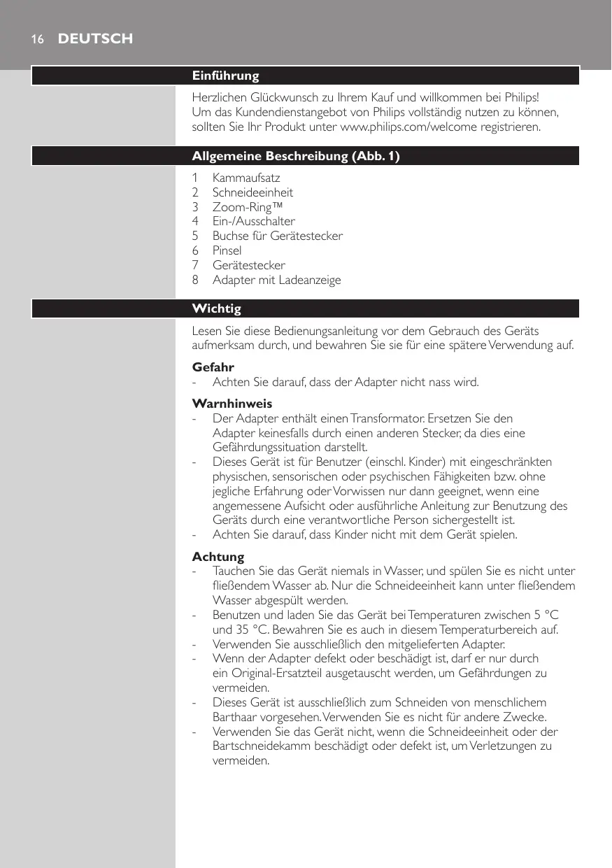 Kammaufsatz Schneideeinheit Zoom-Ring™ Ein-/Ausschalter Buchse für Gerätestecker Pinsel Gerätestecker Adapter mit Ladeanzeige Wichtig Lesen Sie diese Bedienungsanleitung vor dem Gebrauch des Geräts aufmerksam durch, und bewahren Sie sie für eine spätere Verwendung auf. Gefahr -- Achten Sie darauf, dass der Adapter nicht nass wird. Warnhinweis -- Der Adapter enthält einen Transformator. Ersetzen Sie den Adapter keinesfalls durch einen anderen Stecker, da dies eine Gefährdungssituation darstellt. -- Dieses Gerät ist für Benutzer (einschl. Kinder) mit eingeschränkten physischen, sensorischen oder psychischen Fähigkeiten bzw. ohne jegliche Erfahrung oder Vorwissen nur dann geeignet, wenn eine angemessene Aufsicht oder ausführliche Anleitung zur Benutzung des Geräts durch eine verantwortliche Person sichergestellt ist. -- Achten Sie darauf, dass Kinder nicht mit dem Gerät spielen. Achtung -- Tauchen Sie das Gerät niemals in Wasser, und spülen Sie es nicht unter fließendem Wasser ab. Nur die Schneideeinheit kann unter fließendem Wasser abgespült werden. -- Benutzen und laden Sie das Gerät bei Temperaturen zwischen 5 °C und 35 °C. Bewahren Sie es auch in diesem Temperaturbereich auf. -- Verwenden Sie ausschließlich den mitgelieferten Adapter. -- Wenn der Adapter defekt oder beschädigt ist, darf er nur durch ein Original-Ersatzteil ausgetauscht werden, um Gefährdungen zu vermeiden. -- Dieses Gerät ist ausschließlich zum Schneiden von menschlichem Barthaar vorgesehen. Verwenden Sie es nicht für andere Zwecke. -- Verwenden Sie das Gerät nicht, wenn die Schneideeinheit oder der Bartschneidekamm beschädigt oder defekt ist, um Verletzungen zu vermeiden. Deutsch