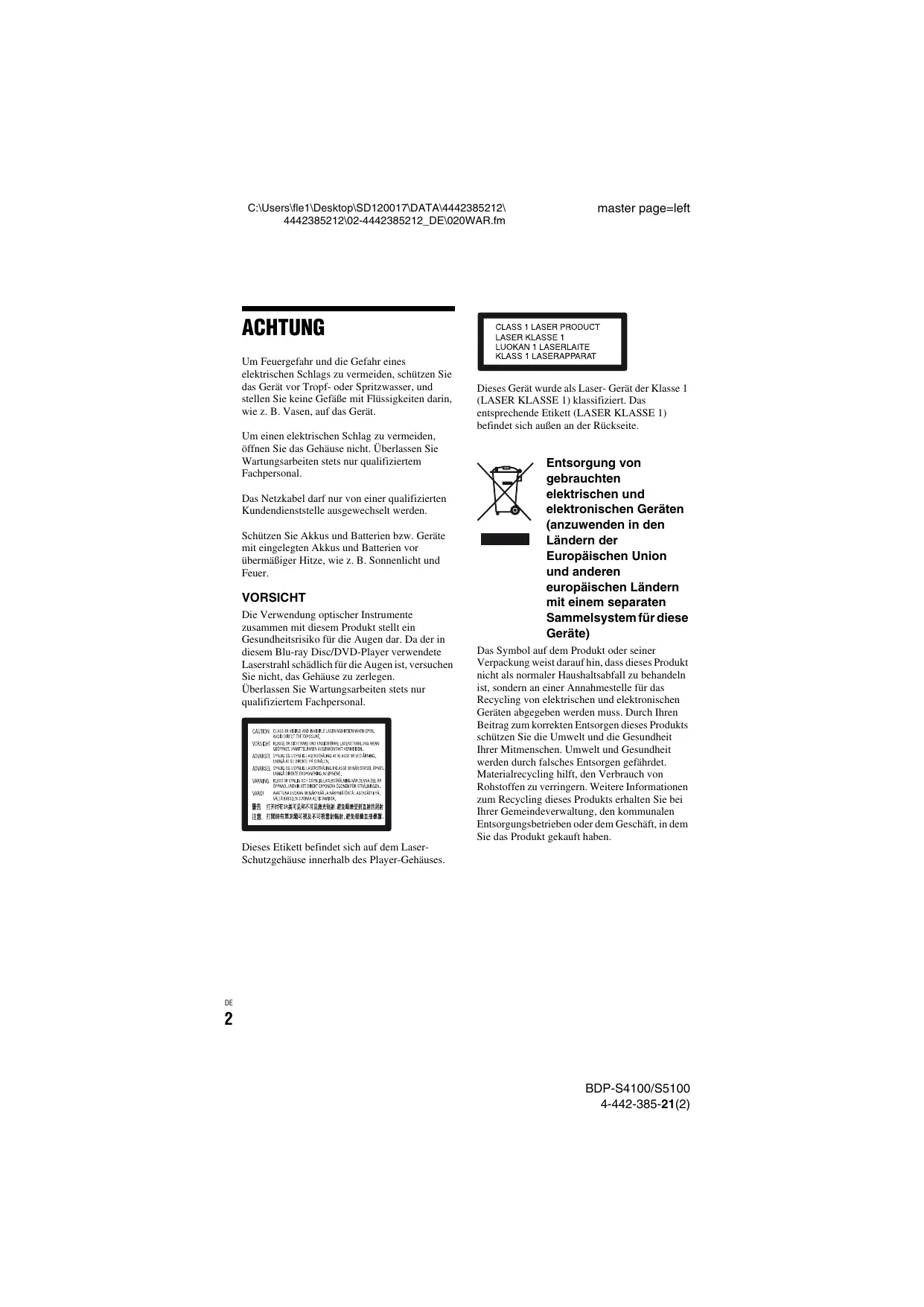 Die Verwendung optischer Instrumente zusammen mit thisem Produkt besteht ein Gesundheitsrisiko für die Augen dar. Da der in thisem Blu-ray Disc/DVD-Player verwendete Laserstrahl schädlich für die Augen ist, versuchen Sie nicht, das Gehäuse zu zerlegen. Überlassen sie Wartungsarbeiten stets nur qualifiziertem Fachpersonal.