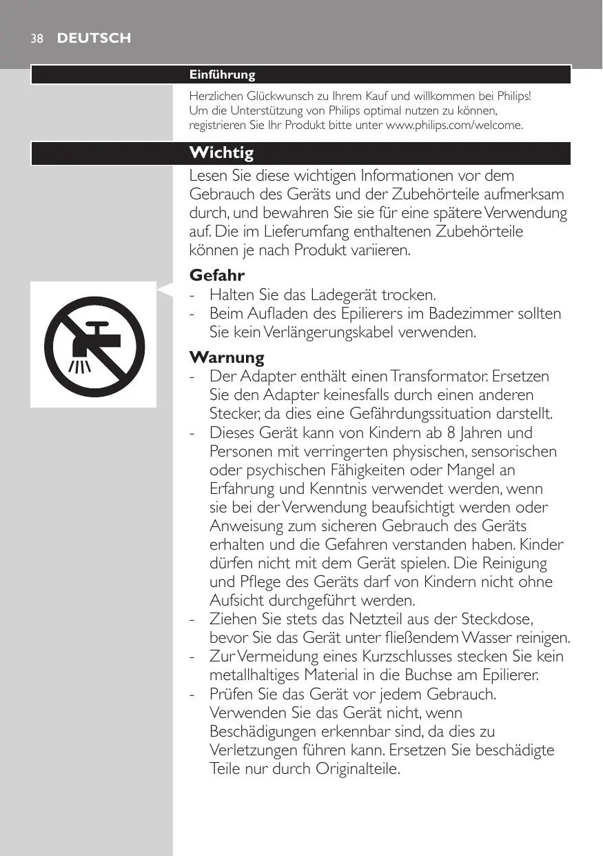 DEUTSCH Einführung Herzlichen Glückwunsch zu Ihrem Kauf und willkommen bei Philips! Um die Unterstützung von Philips optimal nutzen zu können, registrieren Sie Ihr Produkt bitte unter www.philips.com/welcome. Wichtig Lesen Sie diese wichtigen Informationen vor dem Gebrauch des Geräts und der Zubehörteile aufmerksam durch, und bewahren Sie sie für eine spätere Verwendung auf. Die im Lieferumfang enthaltenen Zubehörteile können je nach Produkt variieren. Gefahr -- Halten Sie das Ladegerät trocken. -- Beim Aufladen des Epilierers im Badezimmer sollten Sie kein Verlängerungskabel verwenden. Warnung -- Der Adapter enthält einen Transformator. Ersetzen Sie den Adapter keinesfalls durch einen anderen Stecker, da dies eine Gefährdungssituation darstellt. -- Dieses Gerät kann von Kindern ab 8 Jahren und Personen mit verringerten physischen, sensorischen oder psychischen Fähigkeiten oder Mangel an Erfahrung und Kenntnis verwendet werden, wenn sie bei der Verwendung beaufsichtigt werden oder Anweisung zum sicheren Gebrauch des Geräts erhalten und die Gefahren verstanden haben. Kinder dürfen nicht mit dem Gerät spielen. Die Reinigung und Pflege des Geräts darf von Kindern nicht ohne Aufsicht durchgeführt werden. -- Ziehen Sie stets das Netzteil aus der Steckdose, bevor Sie das Gerät unter fließendem Wasser reinigen. -- Zur Vermeidung eines Kurzschlusses stecken Sie kein metallhaltiges Material in die Buchse am Epilierer. -- Prüfen Sie das Gerät vor jedem Gebrauch. Verwenden Sie das Gerät nicht, wenn Beschädigungen erkennbar sind, da dies zu Verletzungen führen kann. Ersetzen Sie beschädigte Teile nur durch Originalteile. DEUTSCH