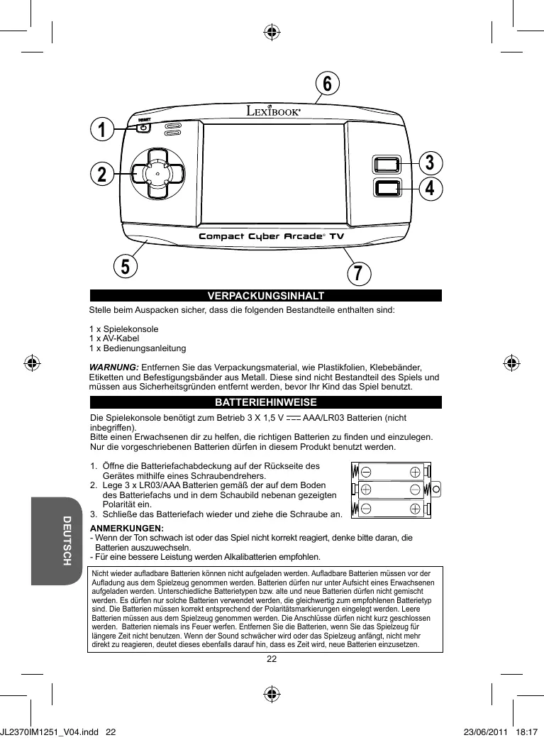 VERPACKUNGSINHALT Stelle beim Auspacken sicher, dass die folgenden Bestandteile enthalten sind: 1 x Spielekonsole 1 x AV-Kabel 1 x Bedienungsanleitung WARNUNG: Entfernen Sie das Verpackungsmaterial, wie Plastikfolien, Klebebänder, Etiketten und Befestigungsbänder aus Metall. Diese sind nicht Bestandteil des Spiels und müssen aus Sicherheitsgründen entfernt werden, bevor Ihr Kind das Spiel benutzt. BATTERIEHINWEISE Die Spielekonsole benötigt zum Betrieb 3 X 1,5 V AAA/LR03 Batterien (nicht inbegriffen). Bitte einen Erwachsenen dir zu helfen, die richtigen Batterien zu finden und einzulegen. Nur die vorgeschriebenen Batterien dürfen in diesem Produkt benutzt werden. DEUTSCH